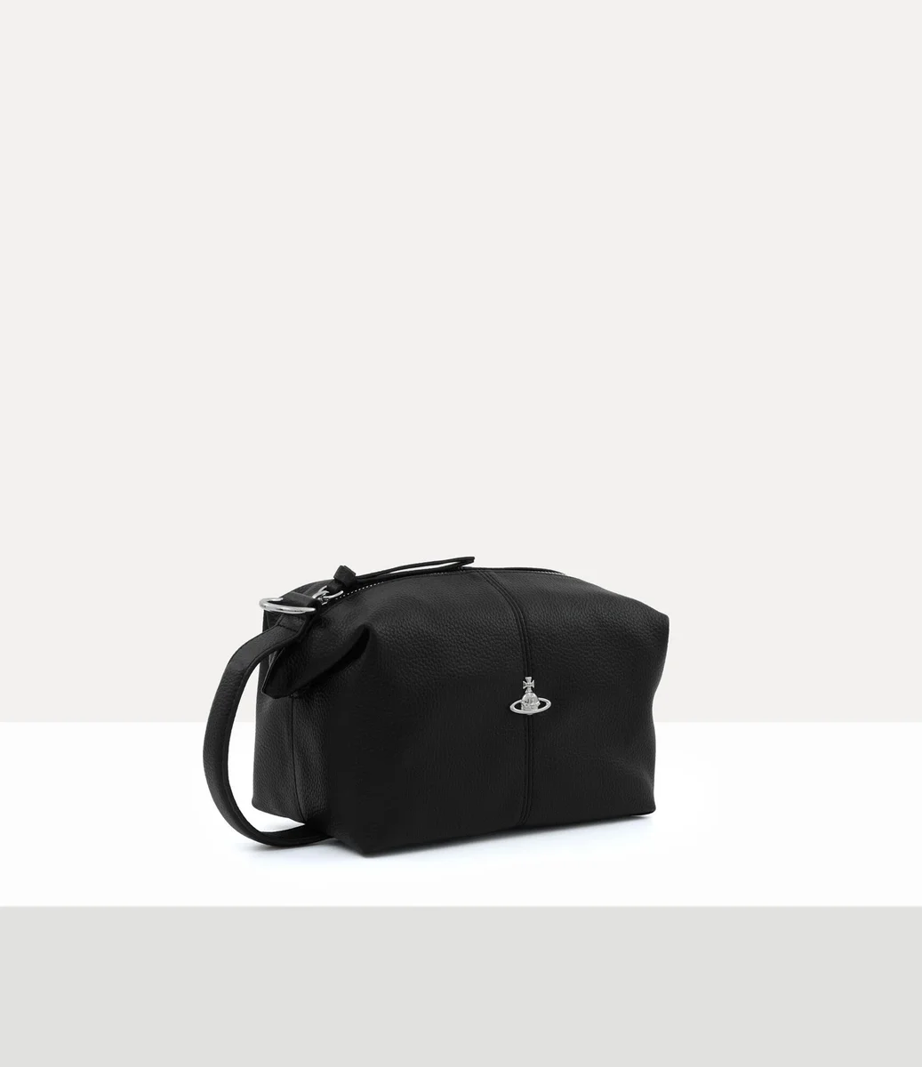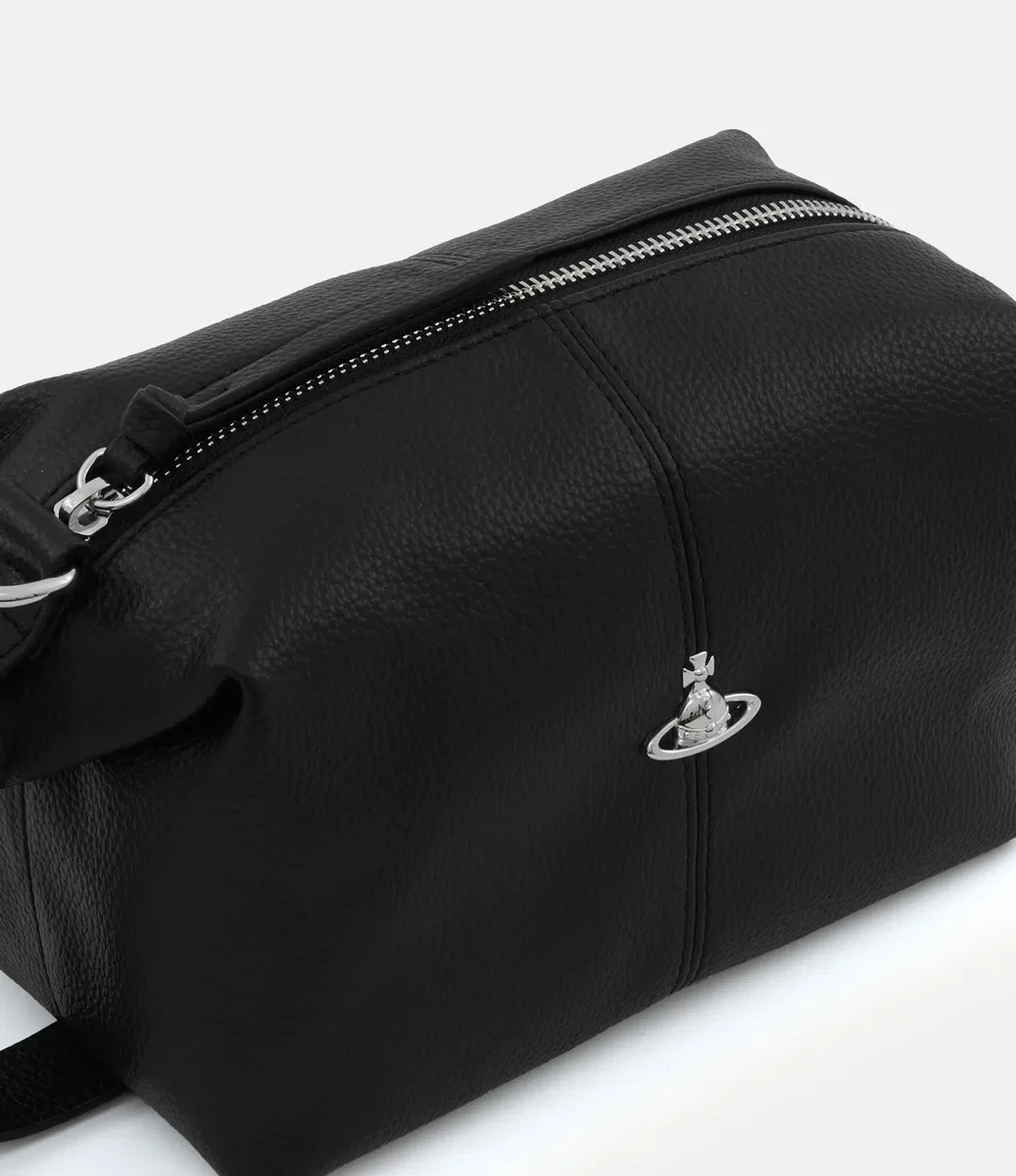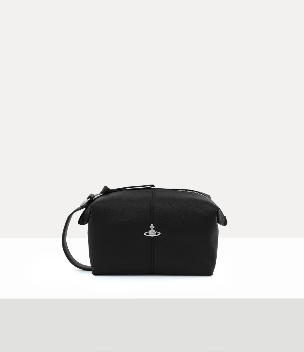 Our wash bag is crafted from PU leather and embossed with a natural grained texture across its rectangular silhouette. Designed with a softly structured profile, the piece opens to a spacious interior and is finished with a three-dimensional silver-tone orb emblem on the front, recalling Vivienne’s vision of launching tradition into the future.