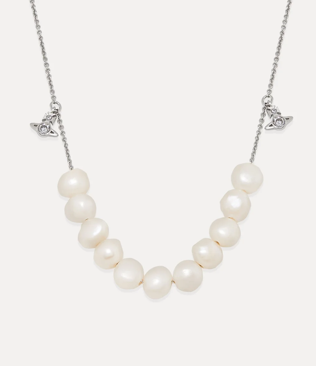 Vivienne Westwood Man. Azul necklace features a row of freshwater baroque pearls strung along a trace chain.