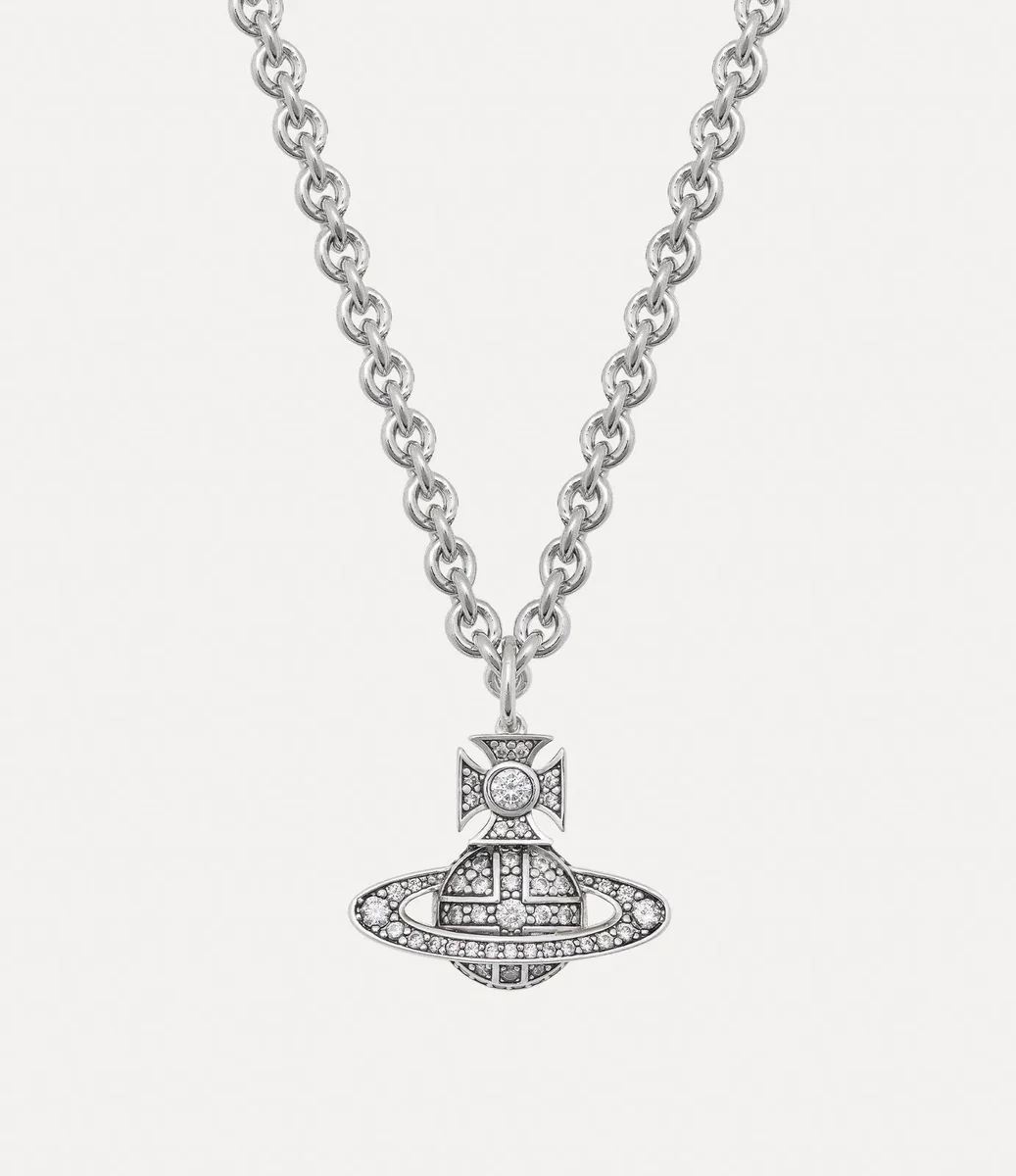 Inspired by Vivienne’s vision for launching tradition into the future, the silhouette of the Man. Carmela Bas Relief Pendant necklace features our signature two-dimensional orb motif in the centre of the chunky link chain. The piece adopts glistening crystal details in the central globe and Saturn ring, complete with polished, silver-tone plating.
