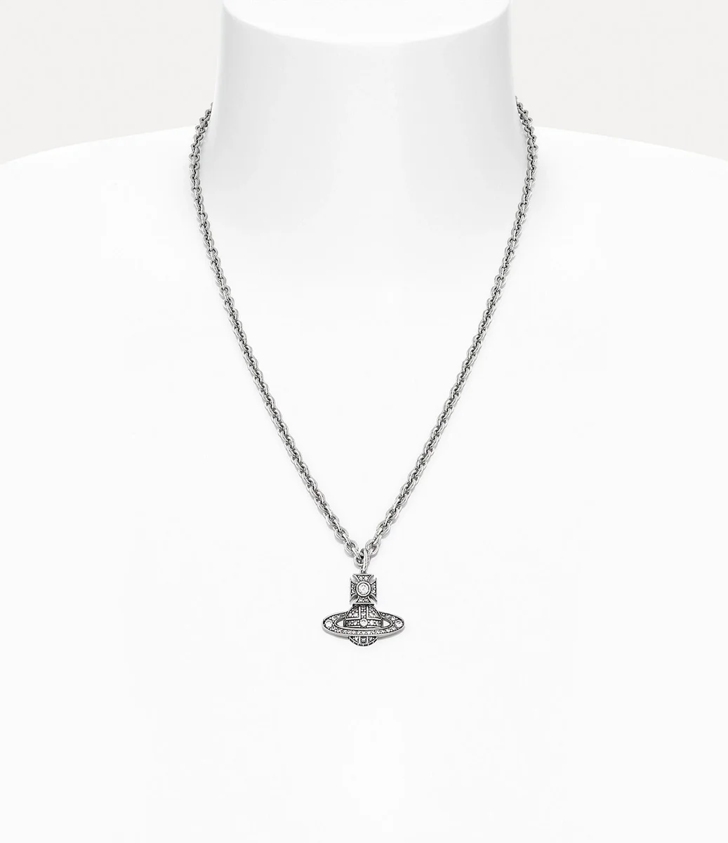 Inspired by Vivienne’s vision for launching tradition into the future, the silhouette of the Man. Carmela Bas Relief Pendant necklace features our signature two-dimensional orb motif in the centre of the chunky link chain. The piece adopts glistening crystal details in the central globe and Saturn ring, complete with polished, platinum-tone plating.