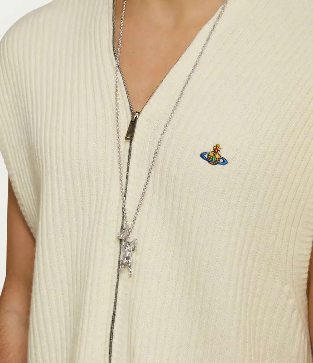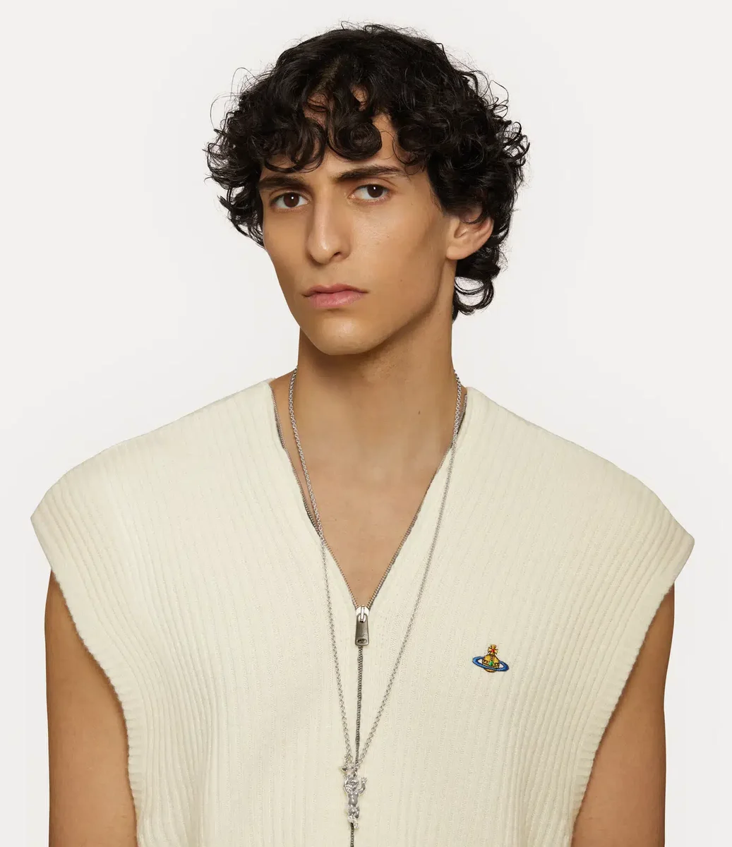 The Man. Satyr Pendant Necklace offers a striking satyr motif at the centre, which pays homage to the heritage designs from Vivienne’s iconic ‘Britain Must Go Pagan’ era (1987–1990). The piece is adorned with silver-tone plating and features our signature dangle orb motif along the refined cable chain, embodying the house’s ethos of launching the past into the future.