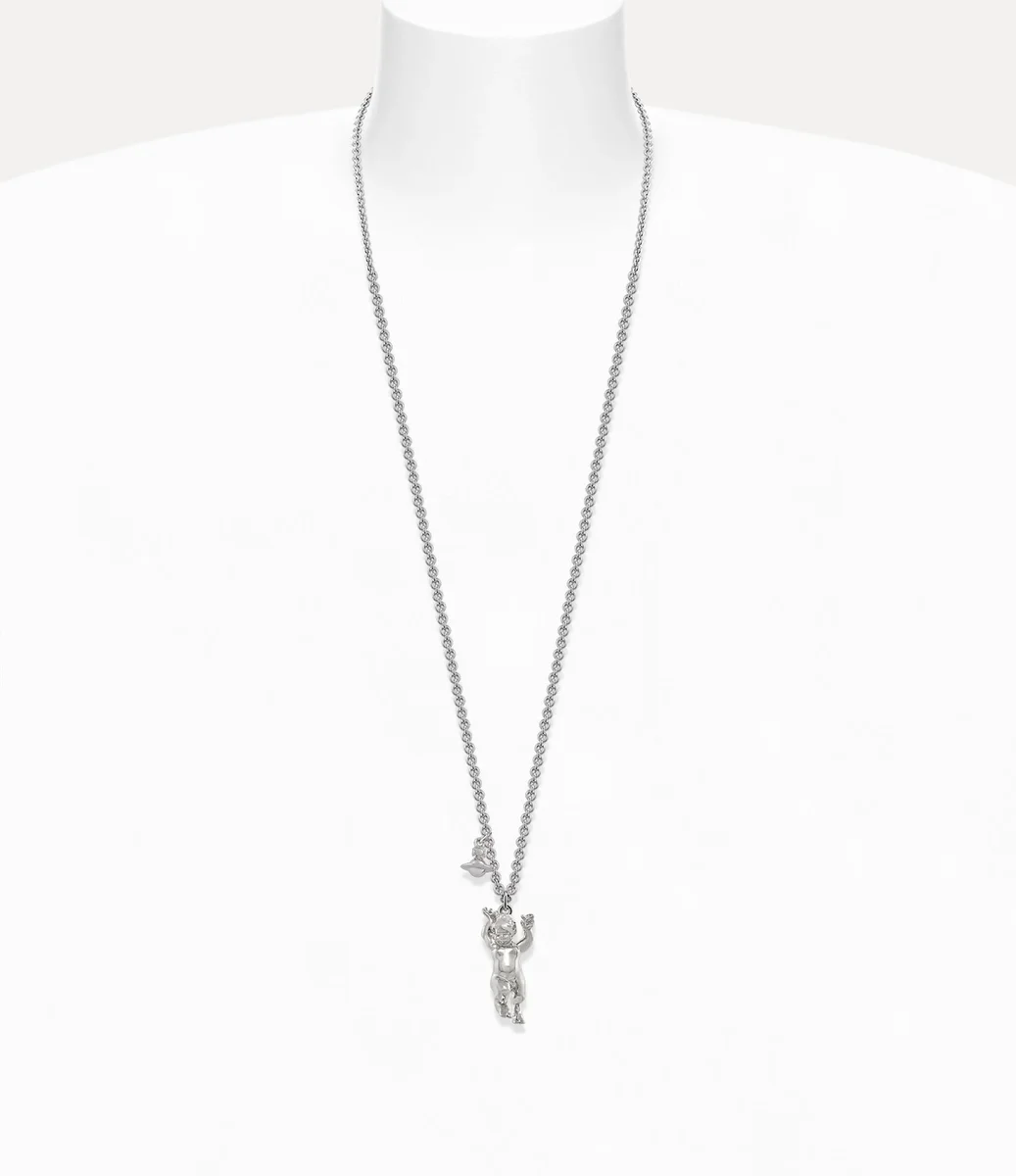 The Man. Satyr Pendant Necklace offers a striking satyr motif at the centre, which pays homage to the heritage designs from Vivienne’s iconic ‘Britain Must Go Pagan’ era (1987–1990). The piece is adorned with silver-tone plating and features our signature dangle orb motif along the refined trace chain, embodying the house’s ethos of launching the past into the future.