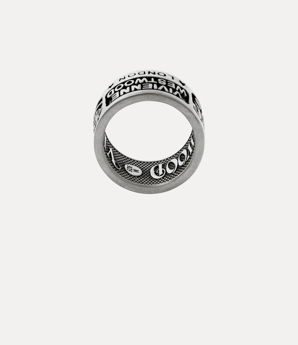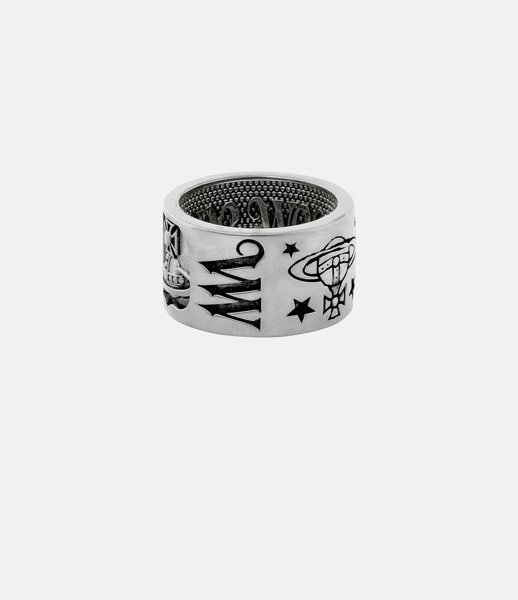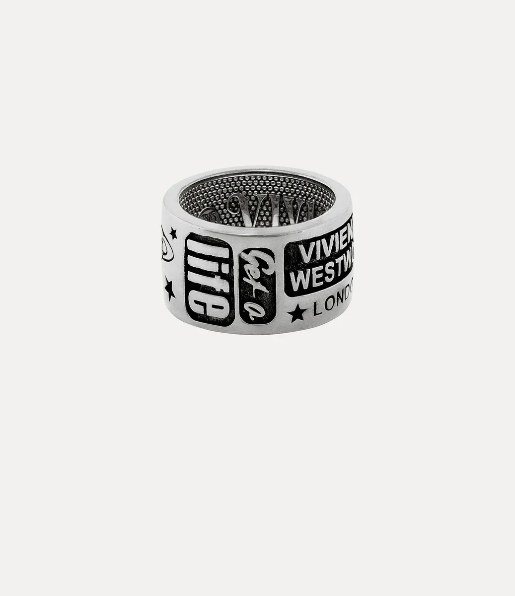 The Lancelot ring, crafted from platinum-plated recycled silver, is inscribed with signature phrases and motifs inspired by the house’s history. The wide statement band is finished with antique-effect detailing, while the inner band features an embossed ‘Vivienne Westwood’ inscription in the signature lettering.