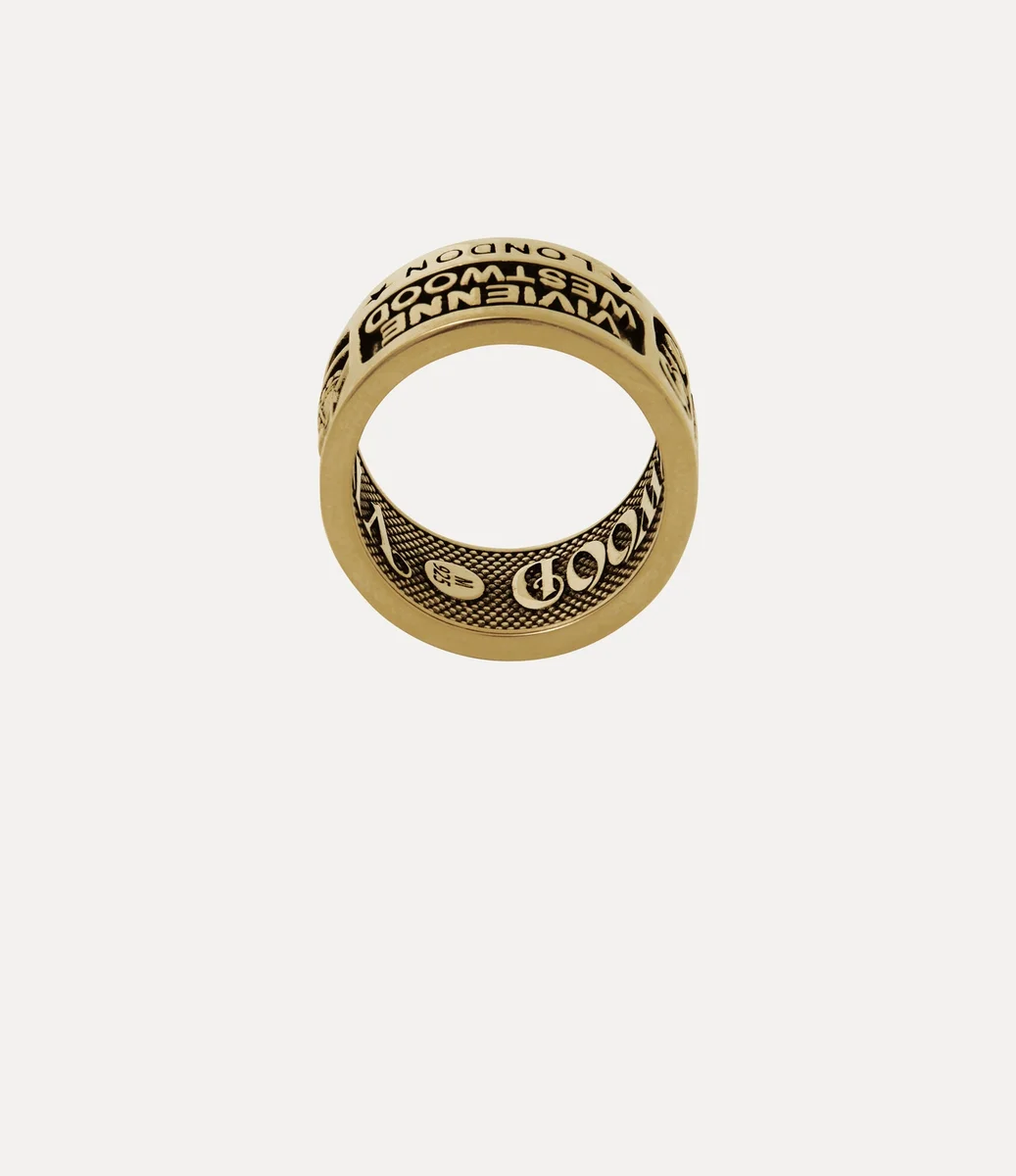 Vivienne Westwood Lancelot ring, crafted from gold-tone plated recycled silver, is inscribed with signature phrases and motifs inspired by the house’s history.