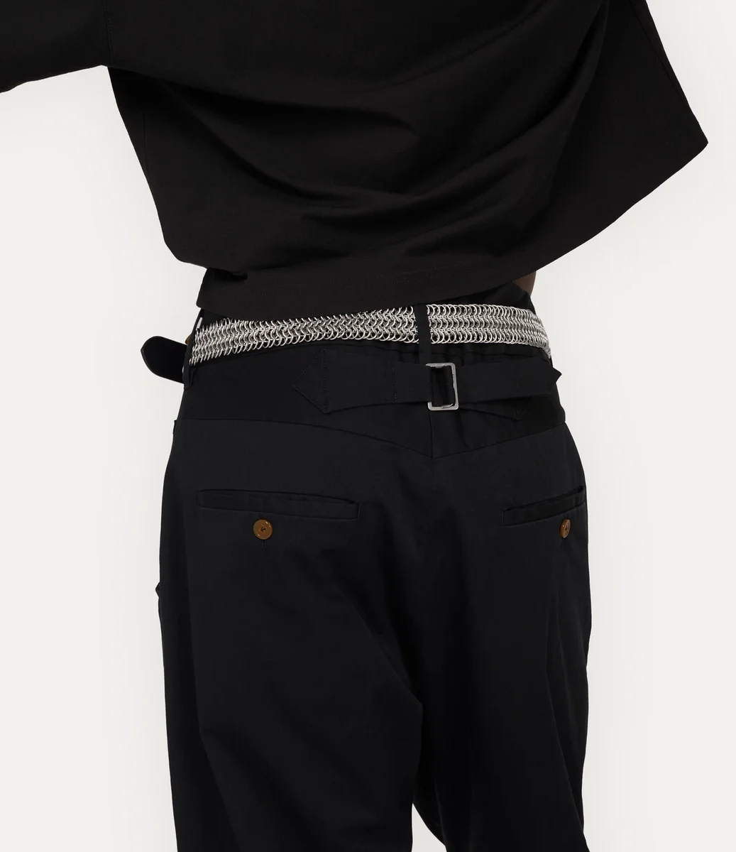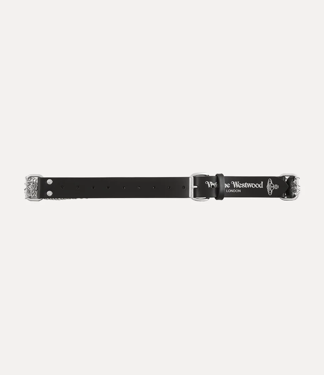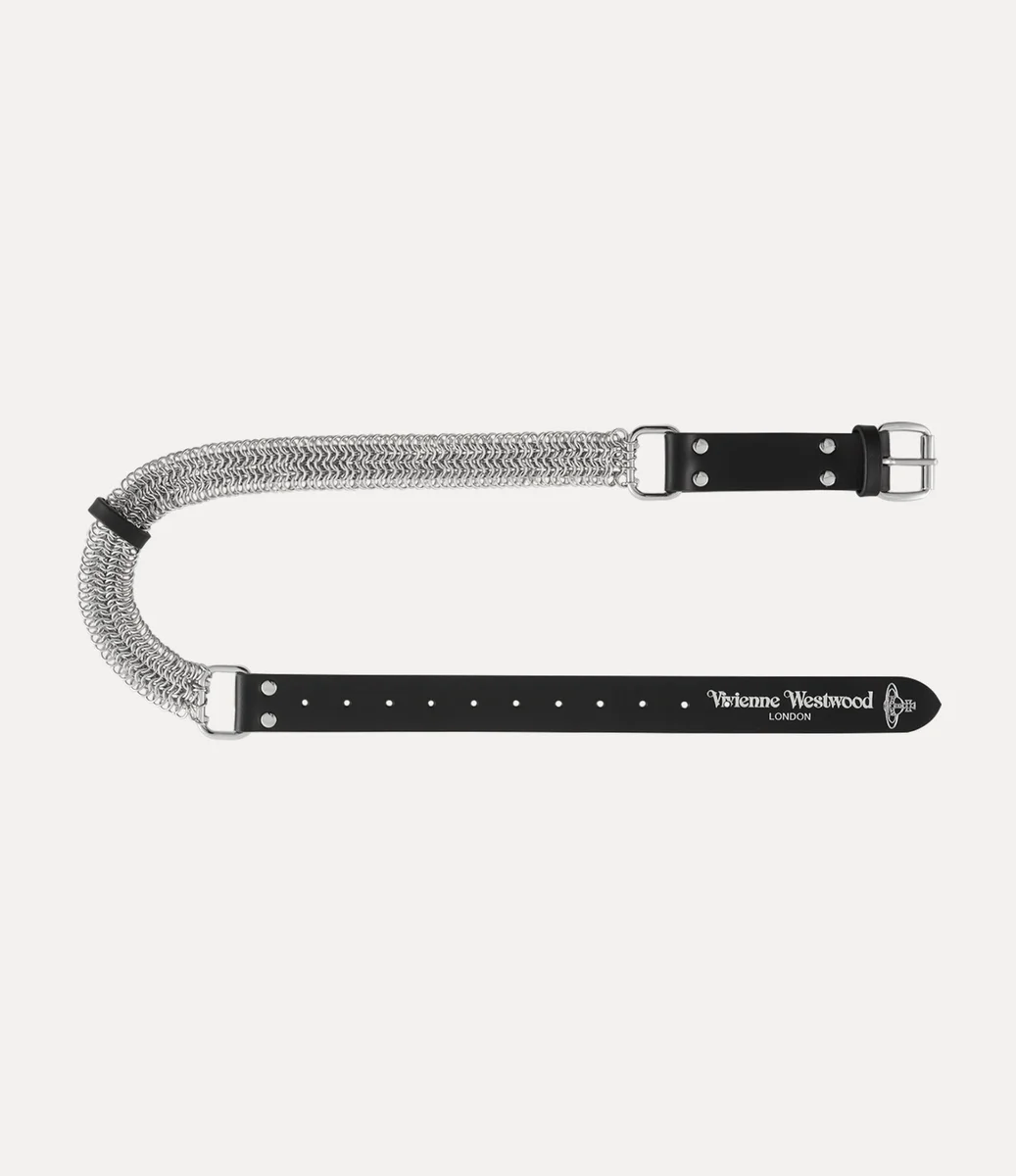 Our Chain leather belt is a new iteration of the house’s signature Roller buckle belt, incorporating sections of polished, silver chainmail inspired by ancient armour, traditionally designed to drape the body for protection. The smooth leather profile is embossed with the signature ‘Vivienne Westwood’ lettering motif, enhanced with metallic foil detailing.