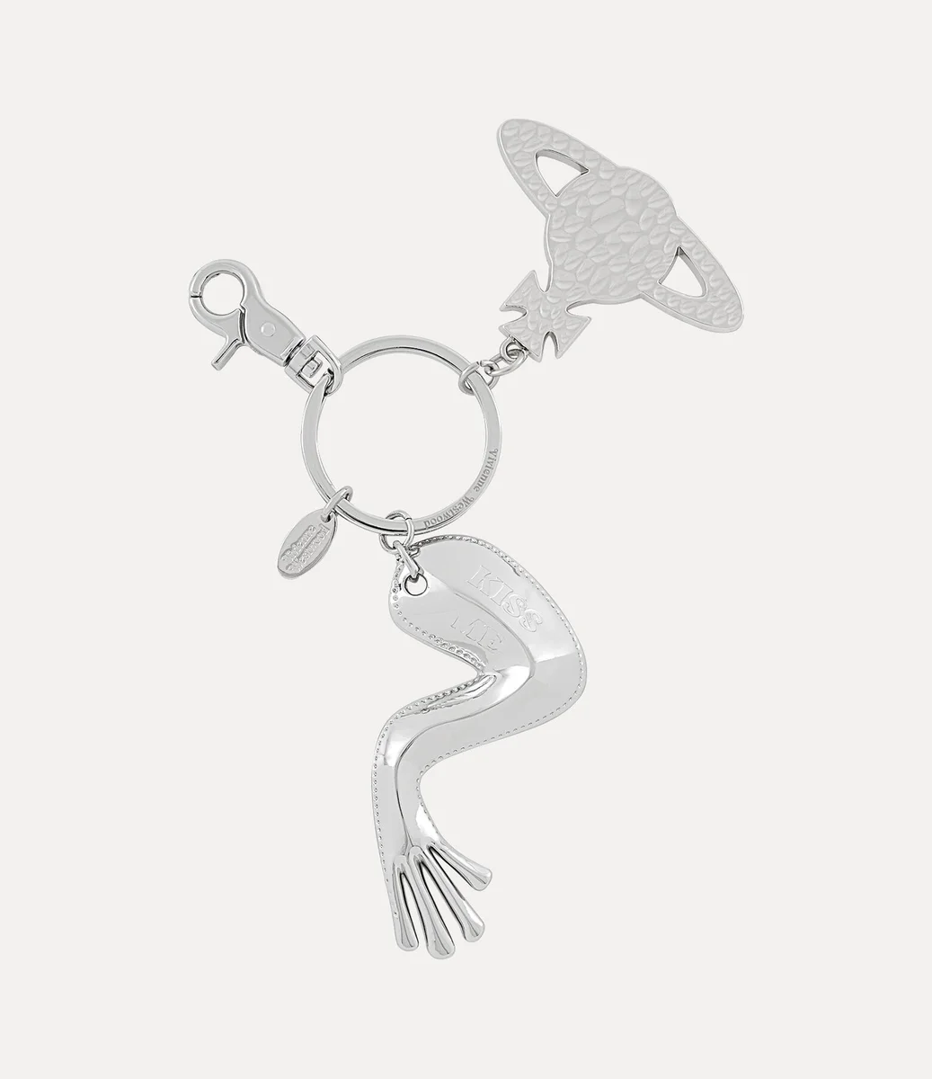 Our Frog Leg Charm keyring, crafted in polished silver-tone plating, playfully nods to the fairytale tradition of ‘kissing the frog.’ Inspired by antique repoussé décor, the ornate leg silhouette is engraved with the slogan ‘Kiss me’ and finished with the house’s signature ‘hammered’ effect orb motif.