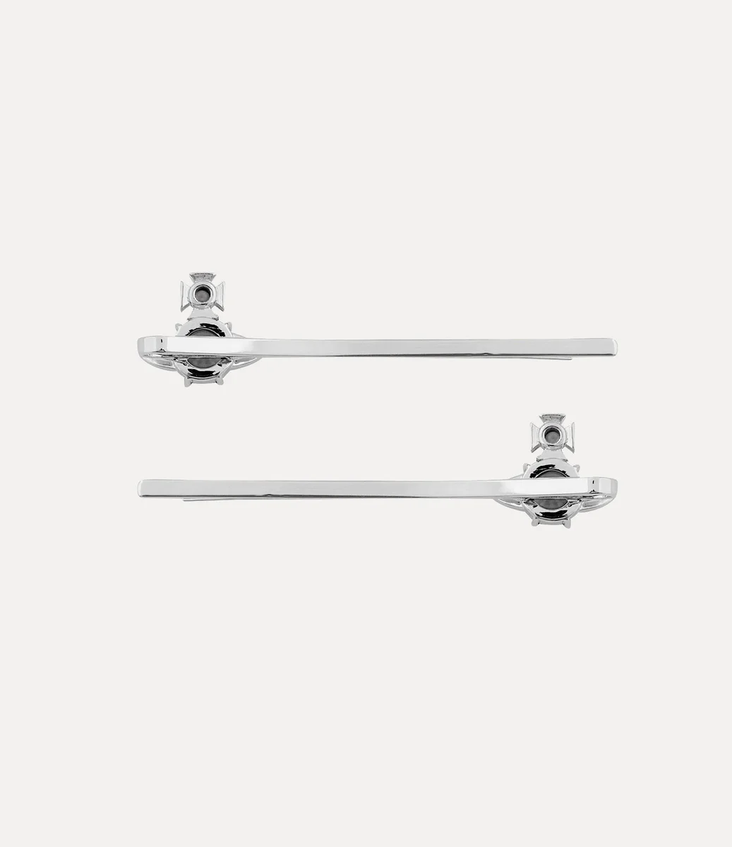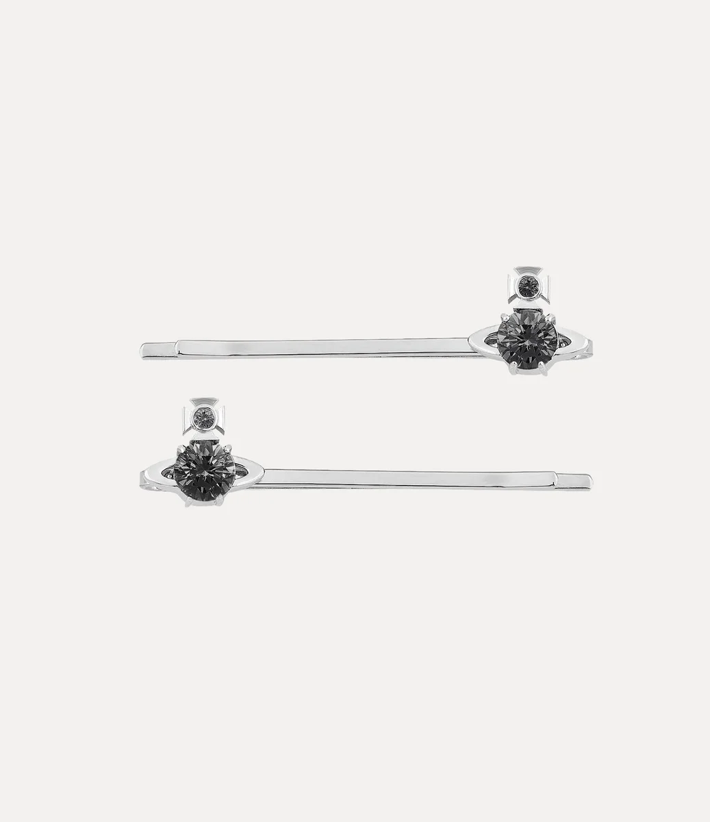 Our Joaquina Bobby pins are offered in polished, silver-toned plating this season. The design features distinct two-dimensional orb in the centre of the design, encrusted with grey crystal details – recalling Vivienne’s vision of taking tradition into the future.