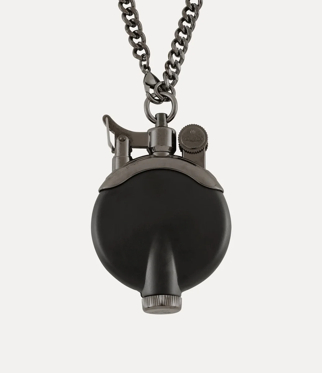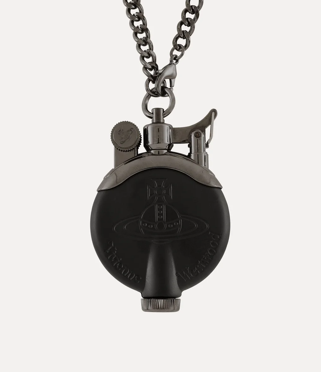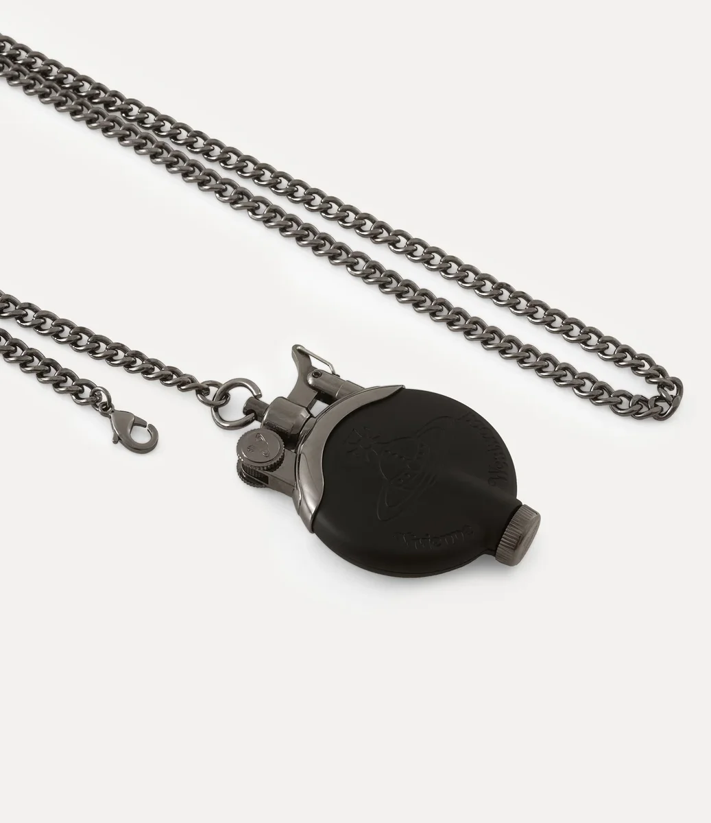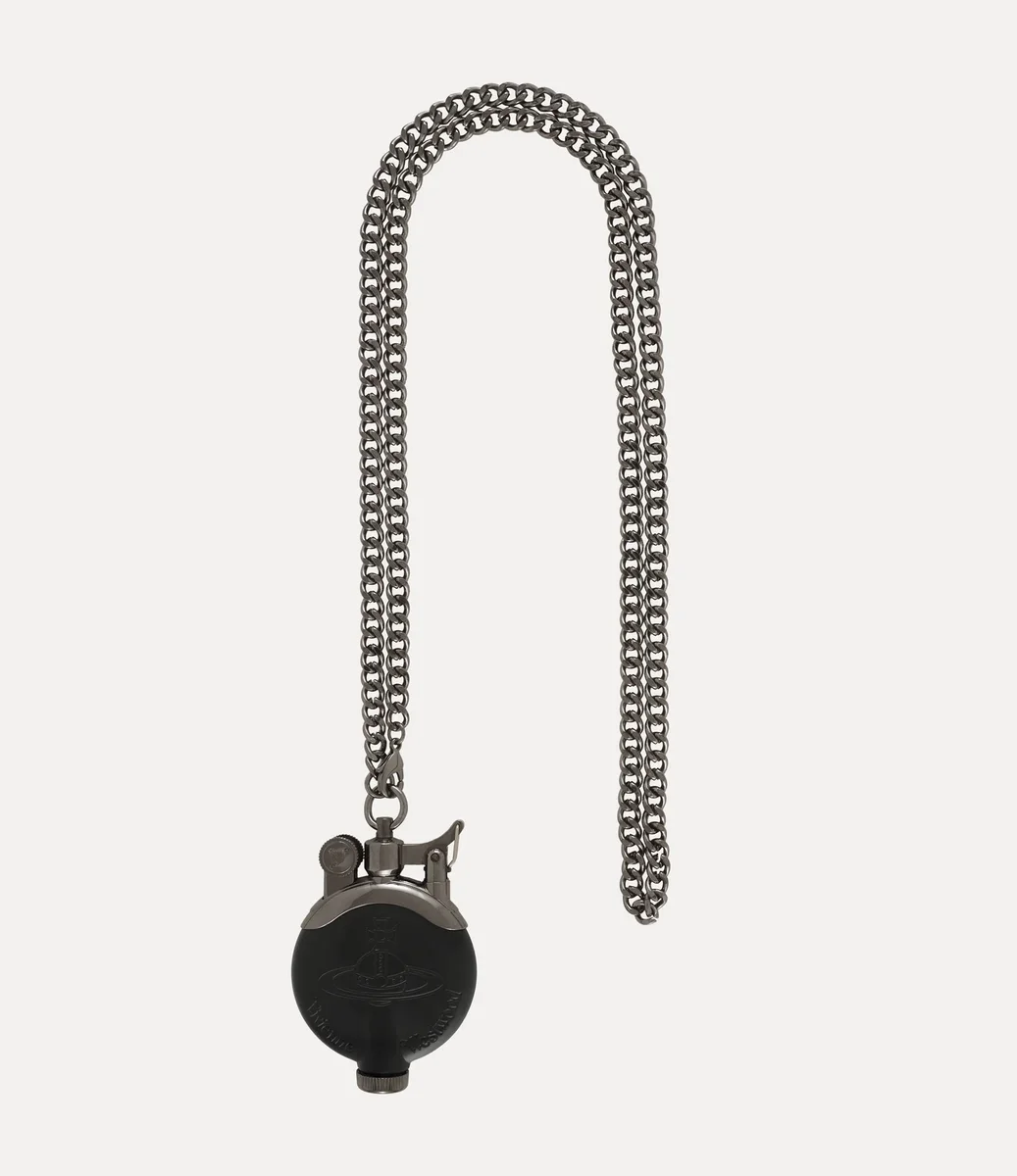 This season, the lighter chain is reintroduced with a mix of silver-tone and matte finishes. The circular design, inspired by antique Victorian watches, is suspended from a link chain and features an engraved orb silhouette on the front. The orb symbolises tradition, encircled by the celestial rings of Saturn, representing the future.