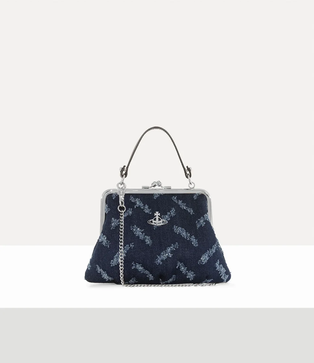 Vivienne Westwood Granny Frame purse in cotton is adorned with this season’s ‘Ripped’ denim motif, complete with a silver-tone orb at the front.