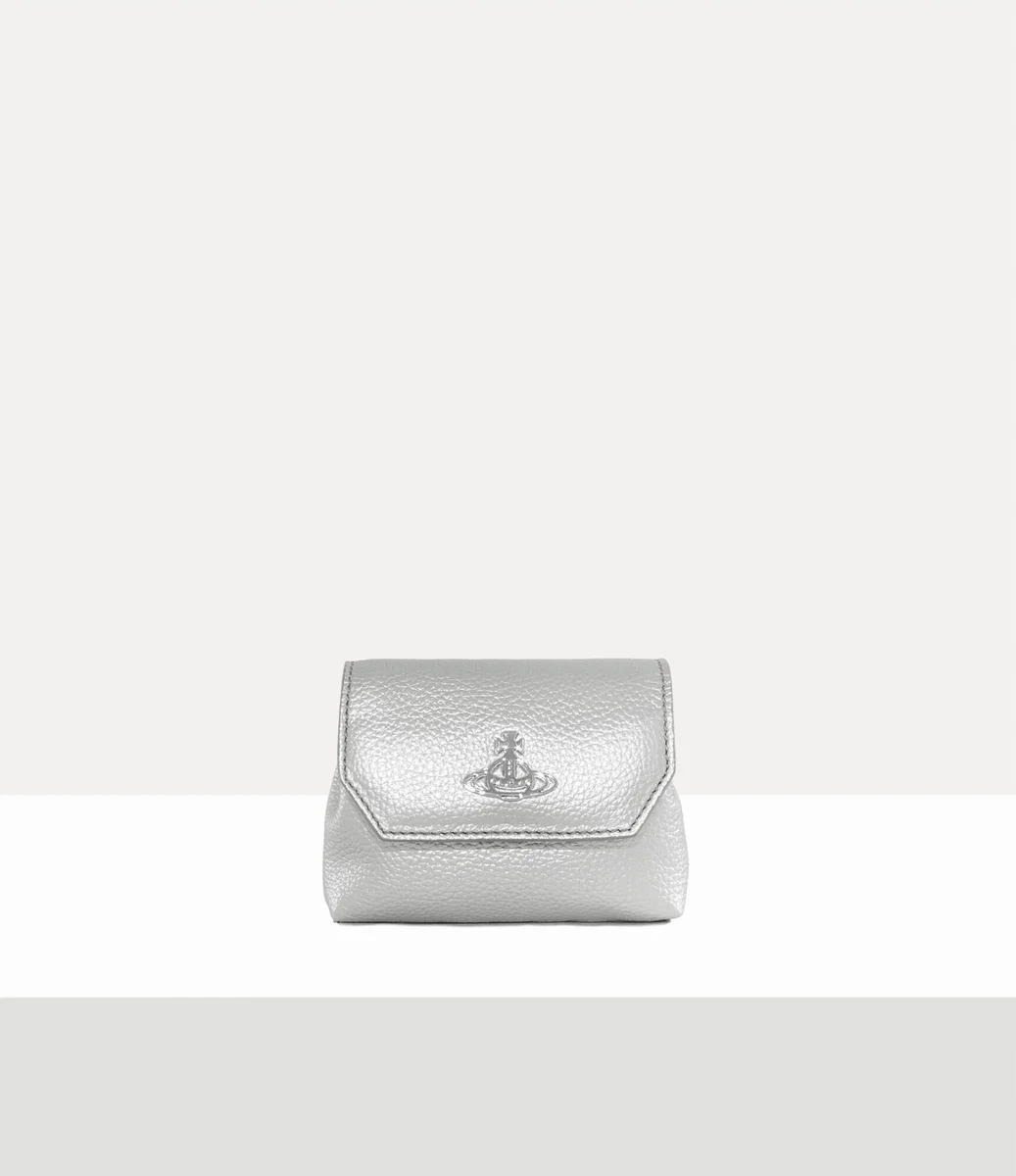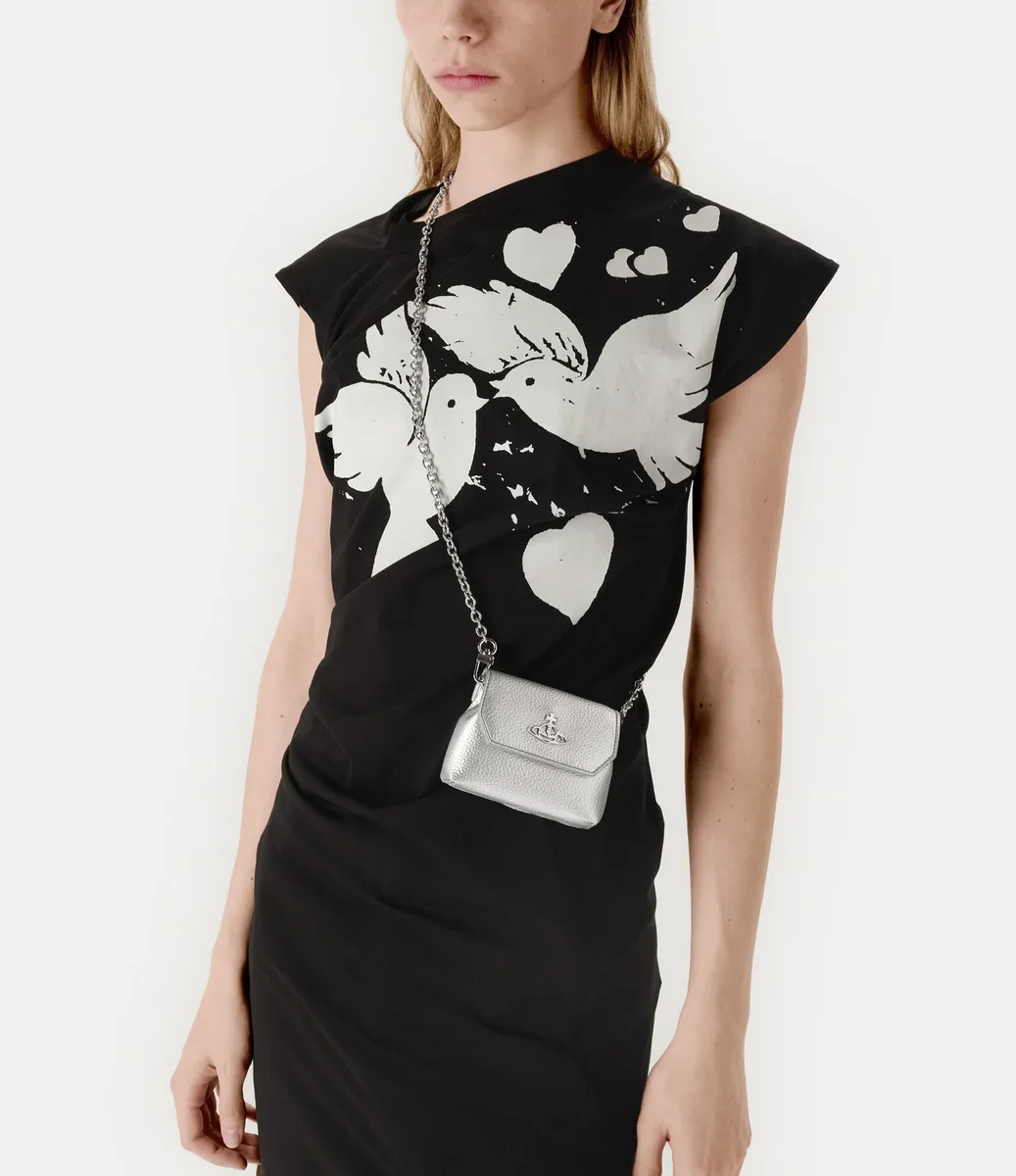 Vivienne Westwood Nano pouch features grain-effect embossing across the design, adorned with silver-toned hardware and a removable chain strap.