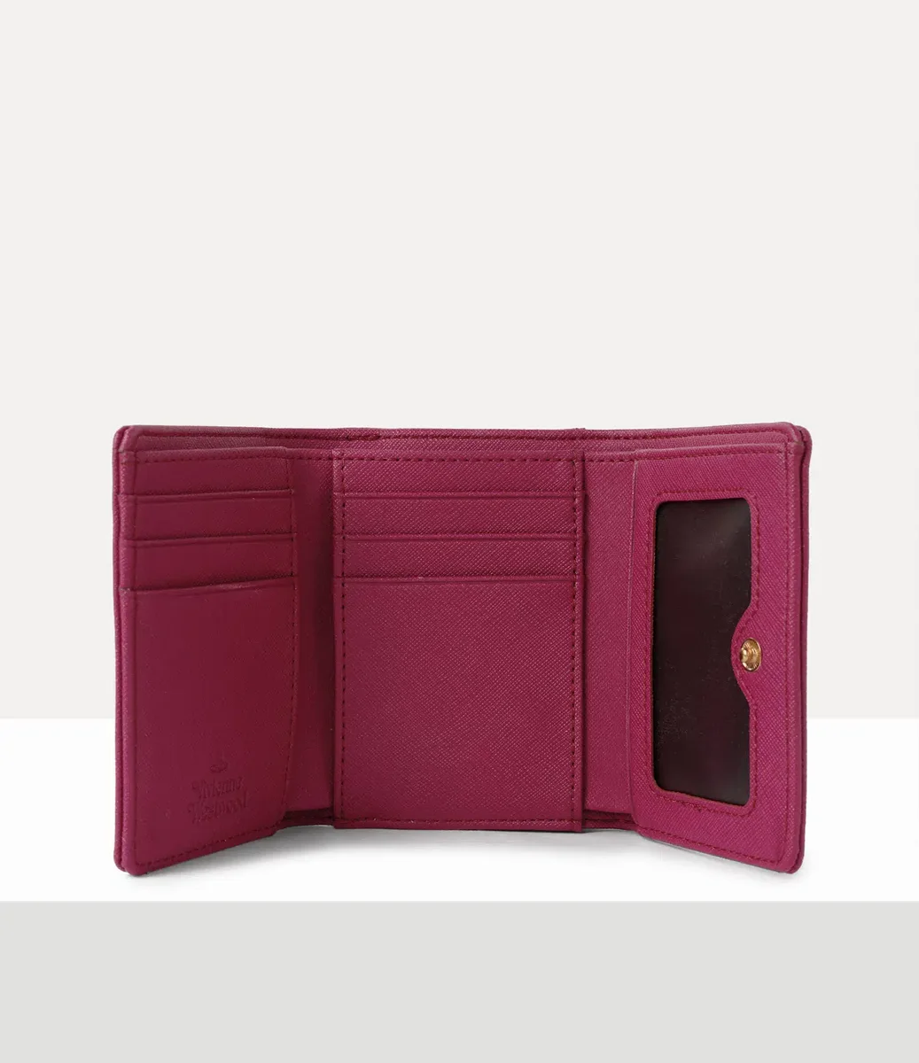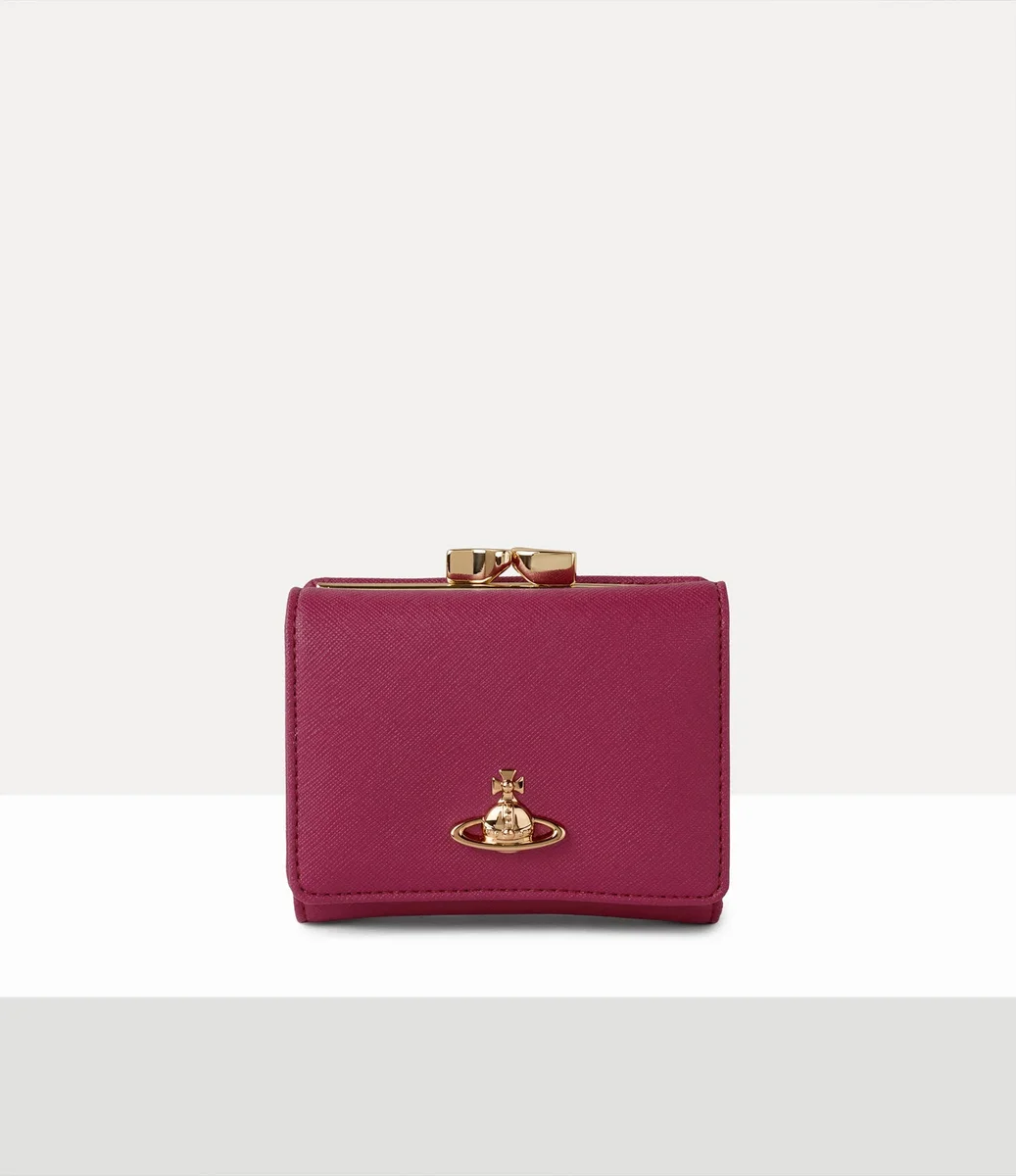 Our Small Frame wallet features a classic PU leather profile, complete with a saffiano-embossed finish across the design. Adorned with a gold-tone bas relief orb motif at the front, the piece recalls Vivienne’s vision of launching tradition into the future.