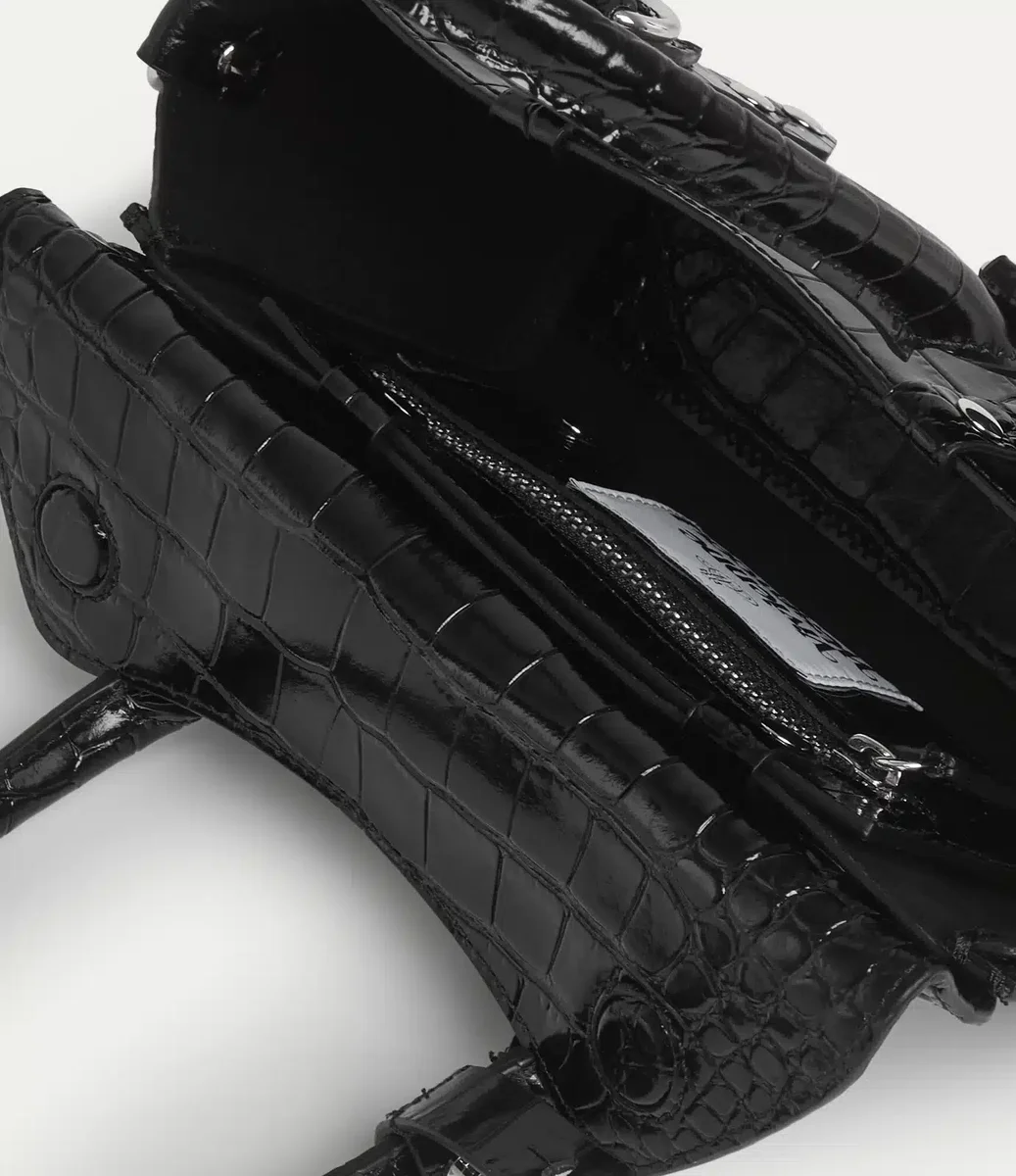 This season, our signature Bettina Mini crossbody bag is crafted in soft leather with an intricate embossed mini croc-effect finish. Inspired by the house’s ‘Betty’ range, the design is detailed with bondage-inspired hardware and a silver-tone D-ring for customisable charms.