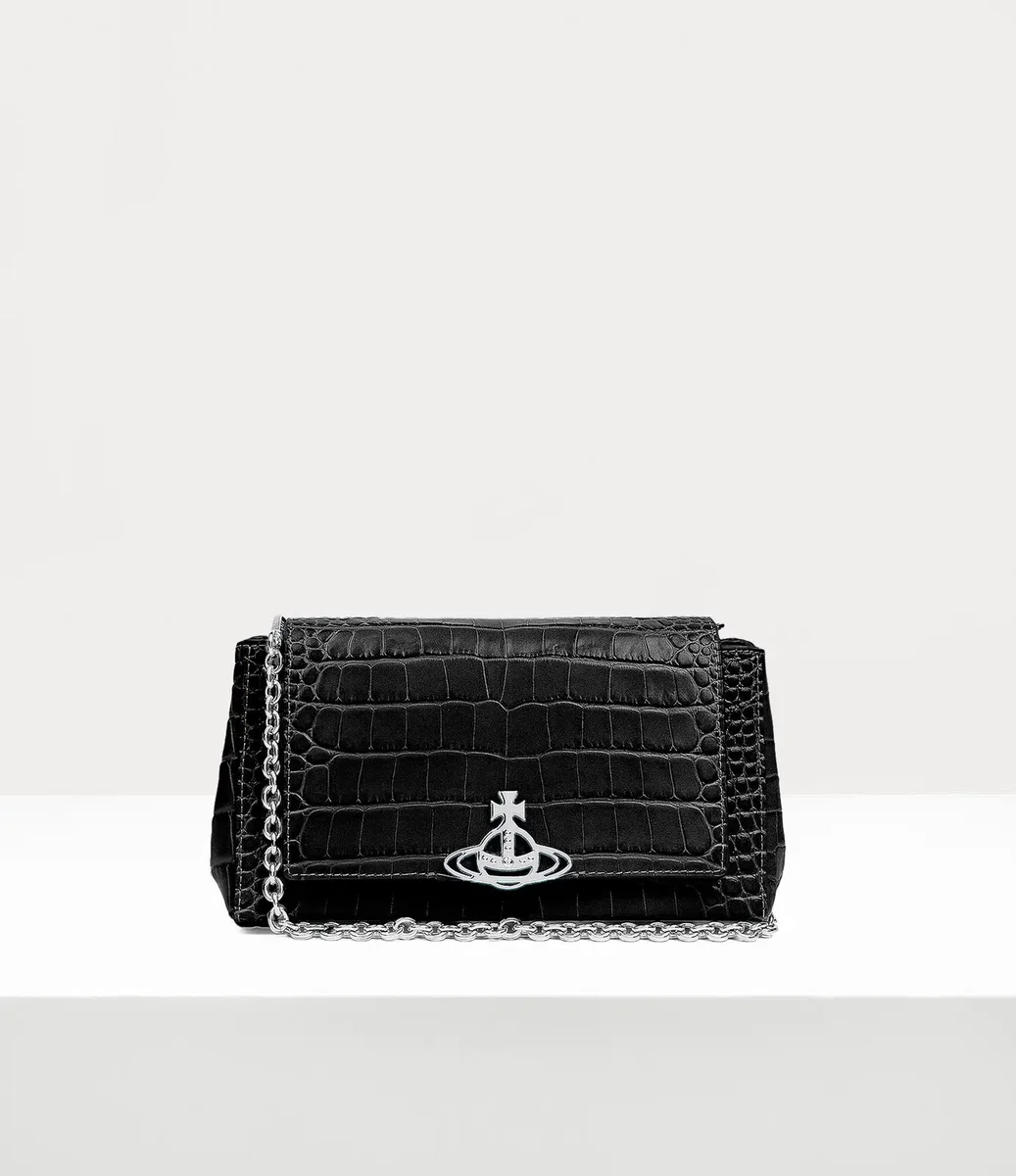 The croc-embossed Hazel Medium handbag features a ‘soft punk’ inspired baguette silhouette and opens to reveal the broken pinstripe lining and vanity mirror. The front flap closure showcases our house’s orb motif, embodying Vivienne Westwood’s vision of blending the past with the future.