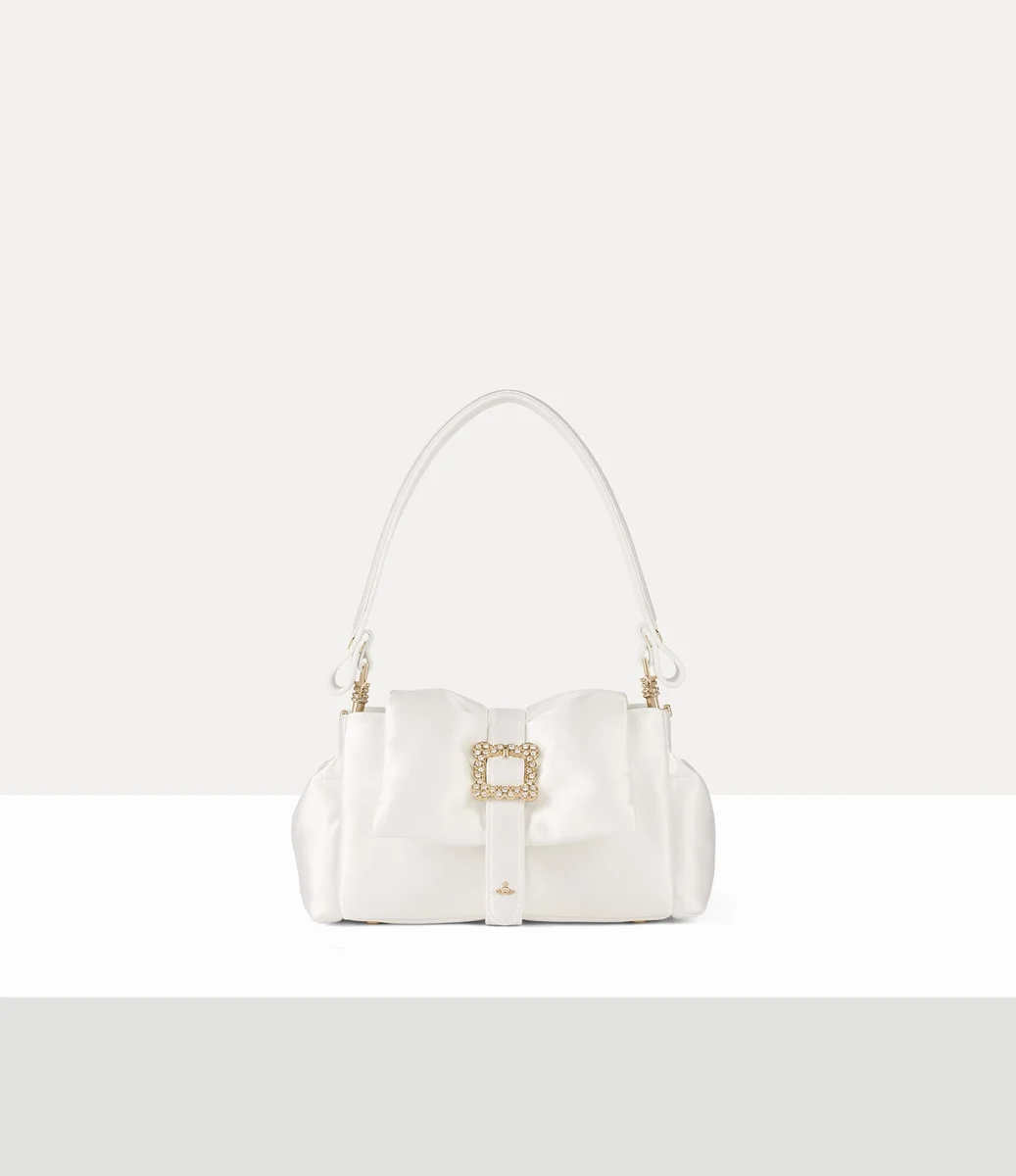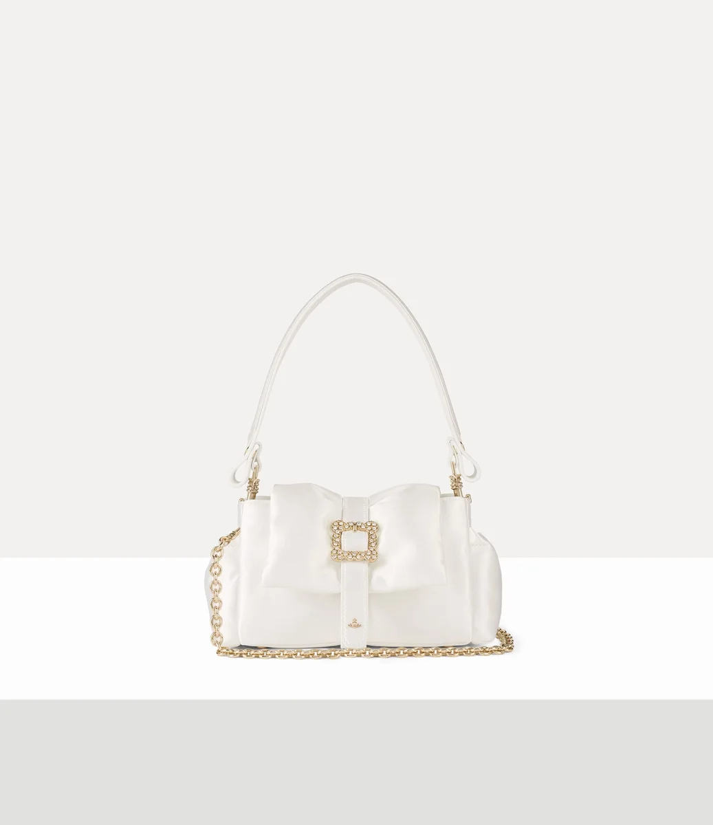 Our Hazel Mini Treasure handbag is crafted from a silk blend and features a top-handle design, complete with our signature pastel-blue lining and polished hardware details. A sculptural belt strap wraps around the soft silhouette, adorned with a decorative orb charm and finished with an opulent crystal-encrusted frame buckle, recalling Vivienne’s reverence for art history.
