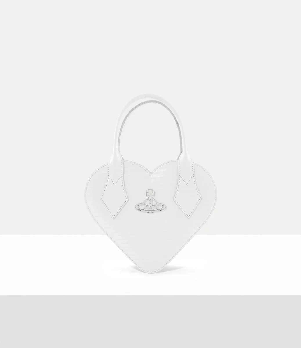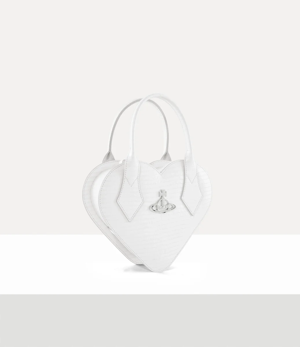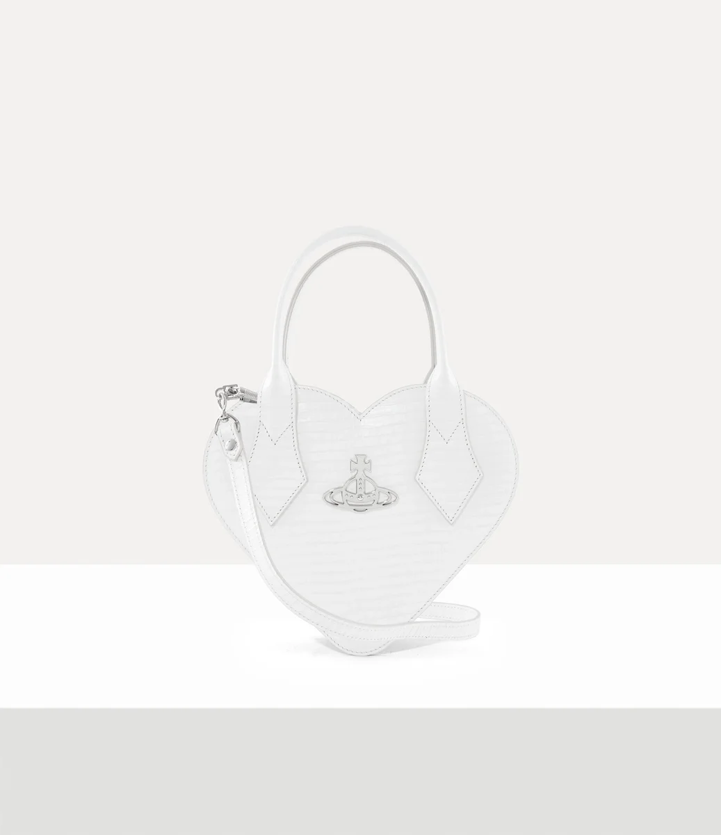 Vivienne Westwood Josephine Heart Crossbody in croc-effect embossed leather features a hear-shaped design with a top handle and orb on the front panel.