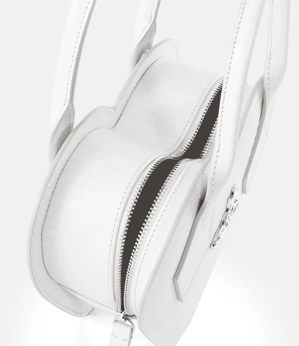 Our Josephine Heart Crossbody bag reimagines the house’s signature heart-shaped motif, recalling Vivienne’s affection for humanity and the planet. Crafted from croc-effect embossed leather, the bag features a sleek single-compartment design with a zip-around fastening, adorned with our classic ‘Line Orb’ motif.