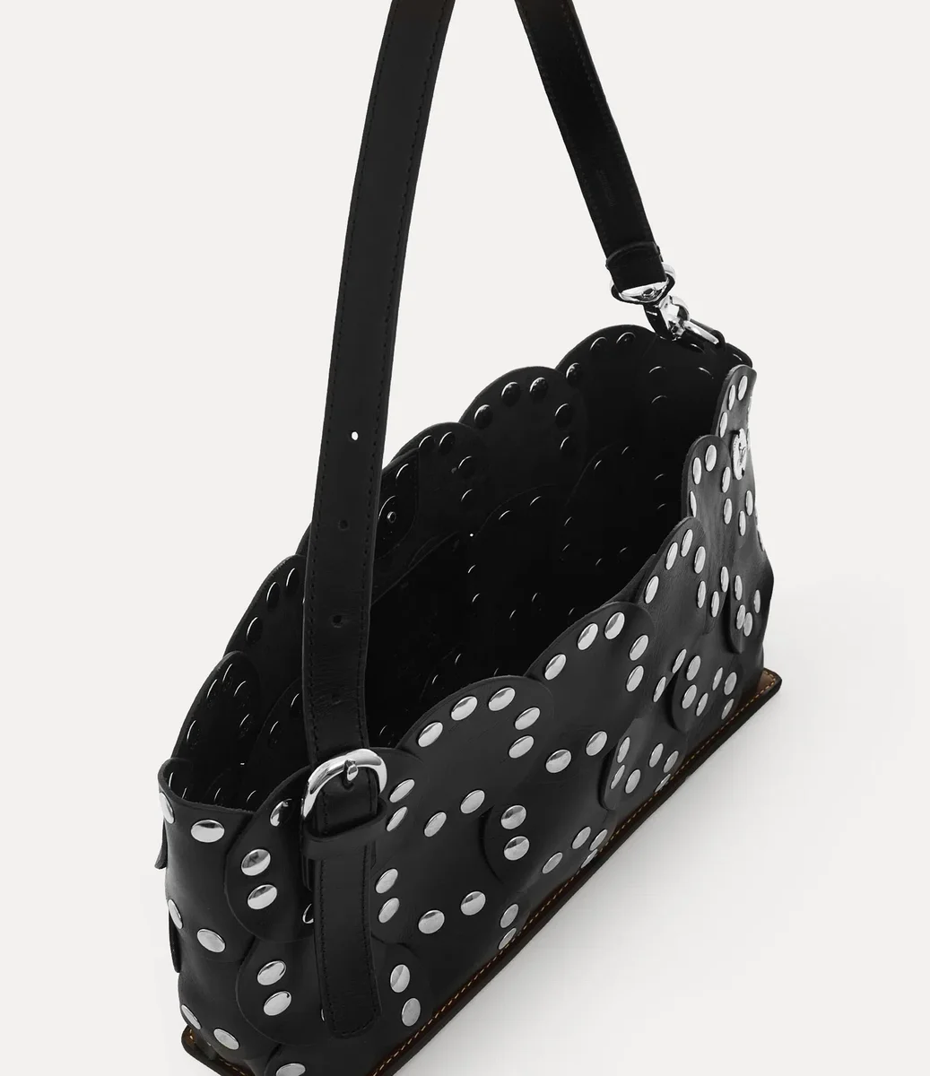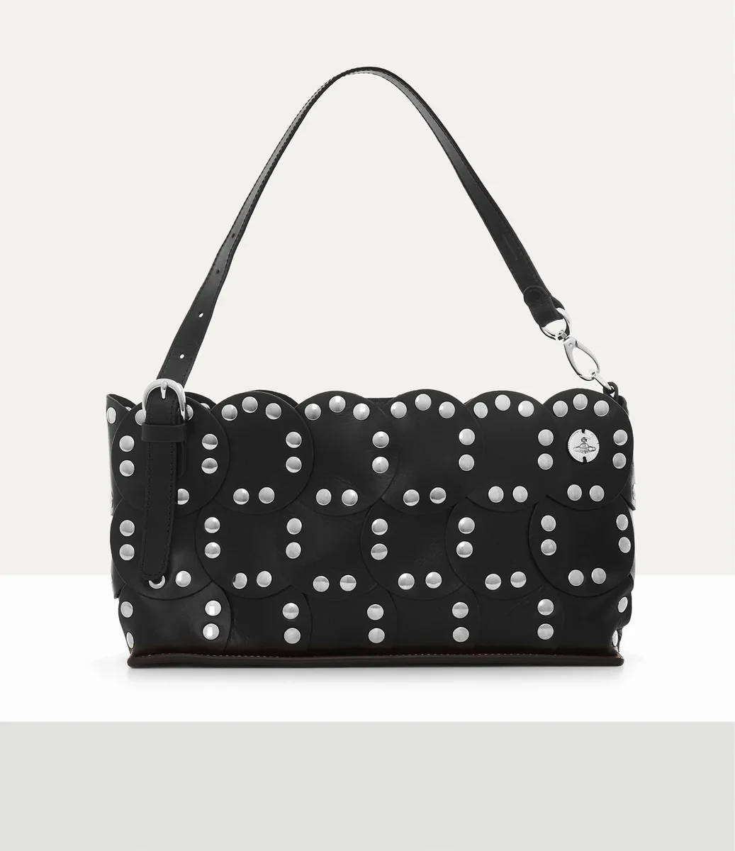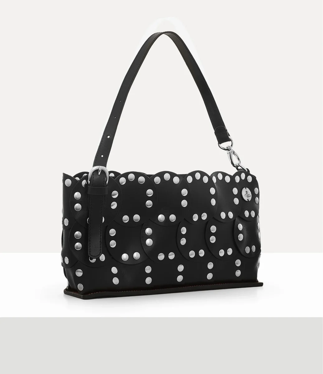 Vivienne Westwood Liz Concho Handbag features hand-cut leather circles studded together and is finished with a dangling orb coin charm.