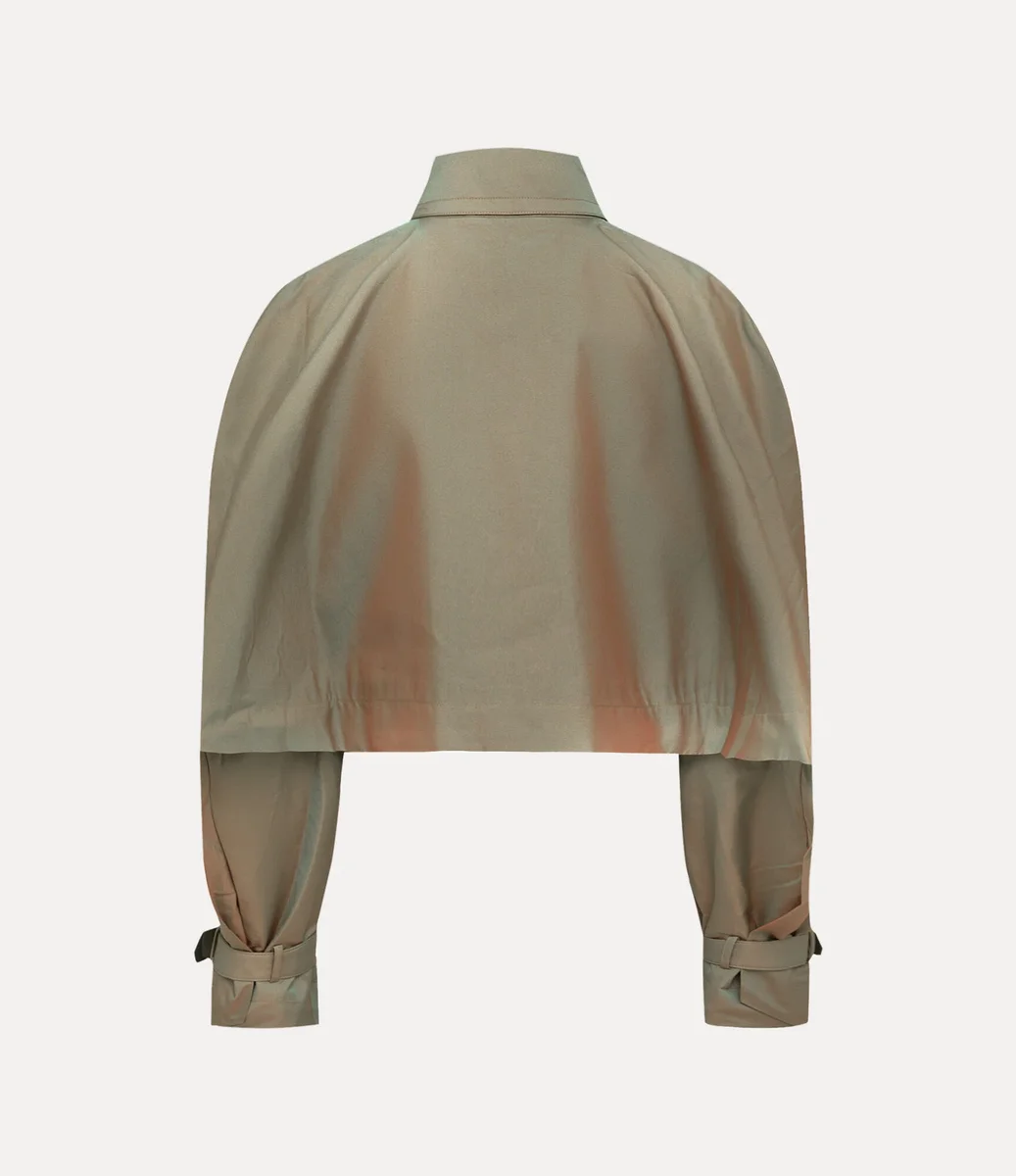 Our Cut Off Graziano Trench coat is reimagined in a two-tone finish, complete with a soft green-brown wash that offers a distressed, iridescent effect. Cut to a voluminous silhouette, the design draws inspiration from the archival ‘Cloud’ tailoring system, first introduced in the Andreas Kronthaler for Vivienne Westwood Autumn-Winter 2022 collection.