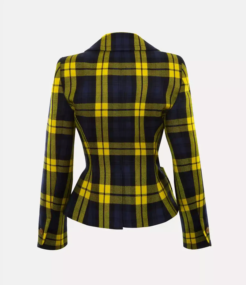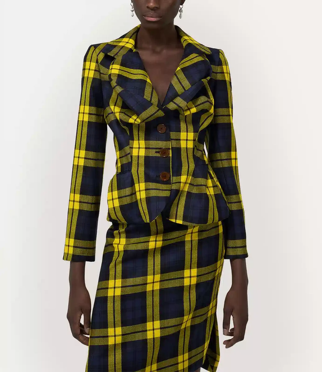 Vivienne Westwood Drunken jacket offers this season’s woollen ‘Moonshine’ tartan, complete with vibrant hues and a front-button design.