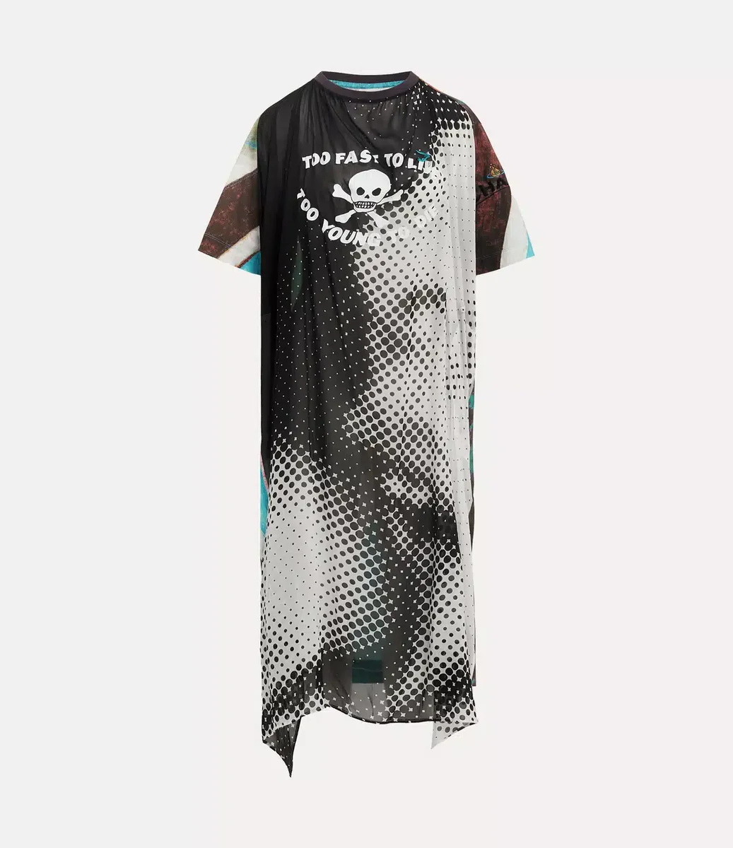 The Worlds End Swing dress is adorned with the house’s signature Union Jack motif across the sleeves and reverse. The piece is complete with the skull and crossbones emblem and the “Too Fast to Live, Too Young to Die” slogan, taken from the signage of our iconic boutique, now known as Worlds’ End.