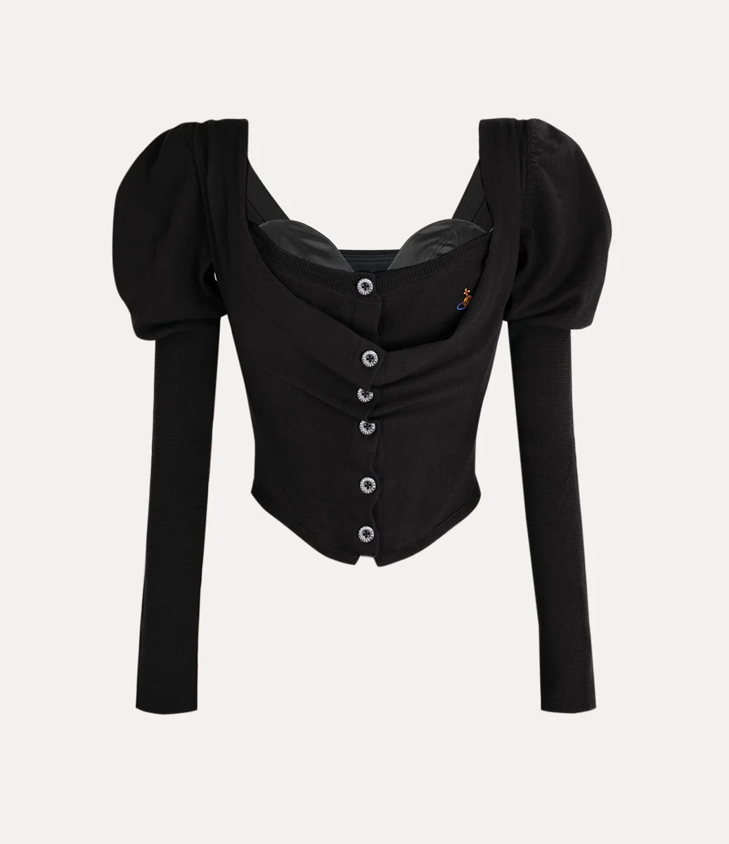Our Bea Corset cardigan is crafted from a soft woollen finish and fastens with shimmering mother-of-pearl buttons. Featuring a contrasting corset-style design and elegant drapery at the neckline, the piece is finished with intricately puffed shoulders for a sculptural silhouette.