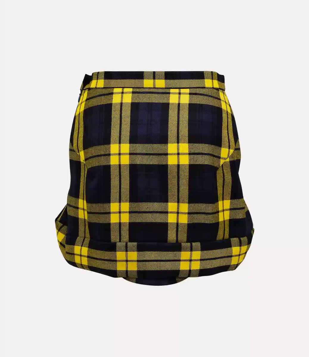 Vivienne Westwood Mini Double Frame Skirt made from wool features the yellow and navy-coloured tartan, a mini-length fit and a folded, asymmetrical hemline.
