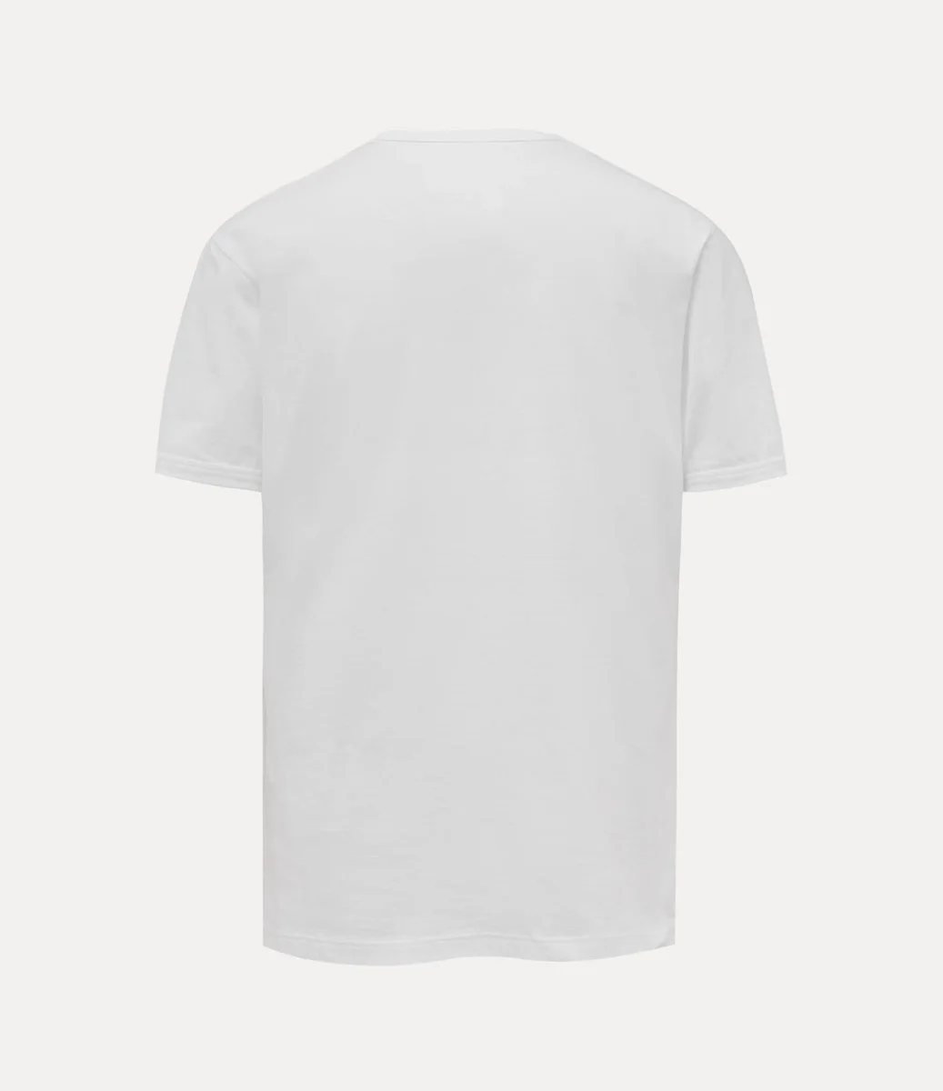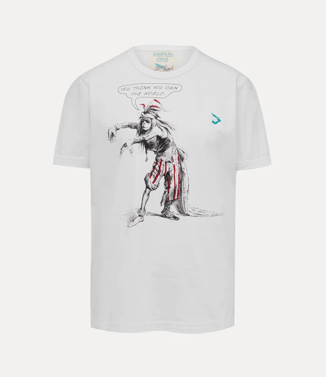 Our Worlds End Classic t-shirt is crafted from soft cotton, featuring short sleeves and a round neckline. The piece is adorned with the archive ‘Arm and Cutlass’ embroidery on the chest and the ‘Own The World’ artwork, a design from Vivienne’s playing cards that illustrates a culture-led economic strategy to save the world, urging us to reflect on our role in shaping the future.