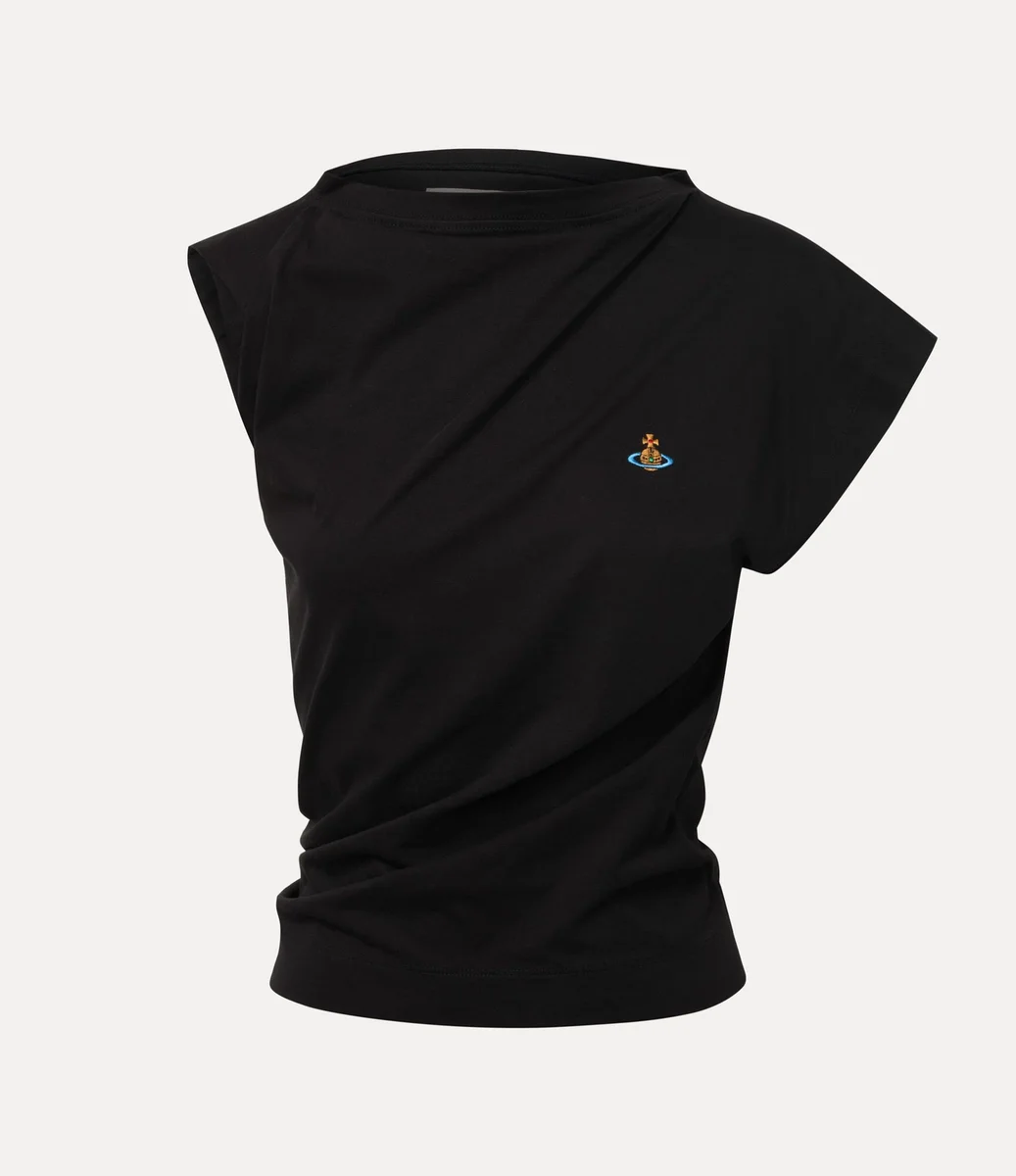 Vivienne Westwood Hebo top with a soft cotton finish and a multicoloured orb embroidery, complete with a slash neckline, drapery and a twist detail at the back.