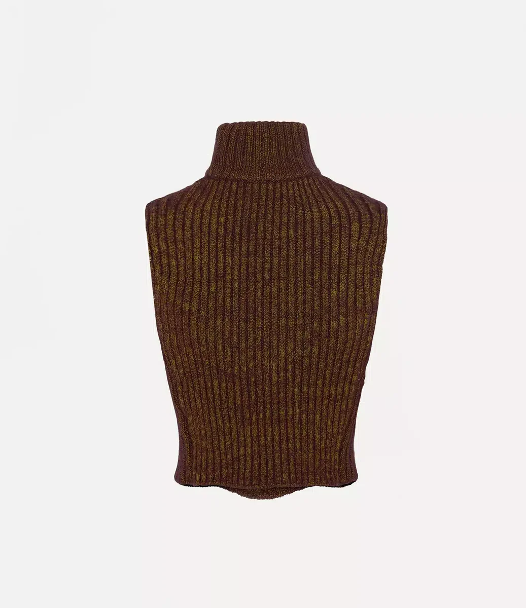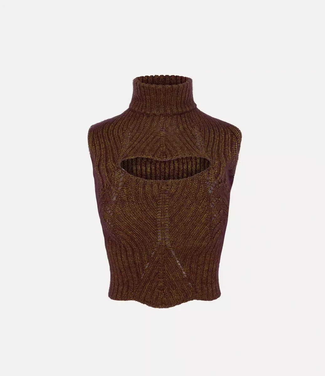 The sleeveless Mary Corset top is crafted from a silk-mohair blend, combining herringbone and rib-knit stitches. Featuring an horizontal slit above the chest, with a corset-style bra beneath the knitted layer for support, the top is finished with ribbed detailing along the high neckline and throughout the design.