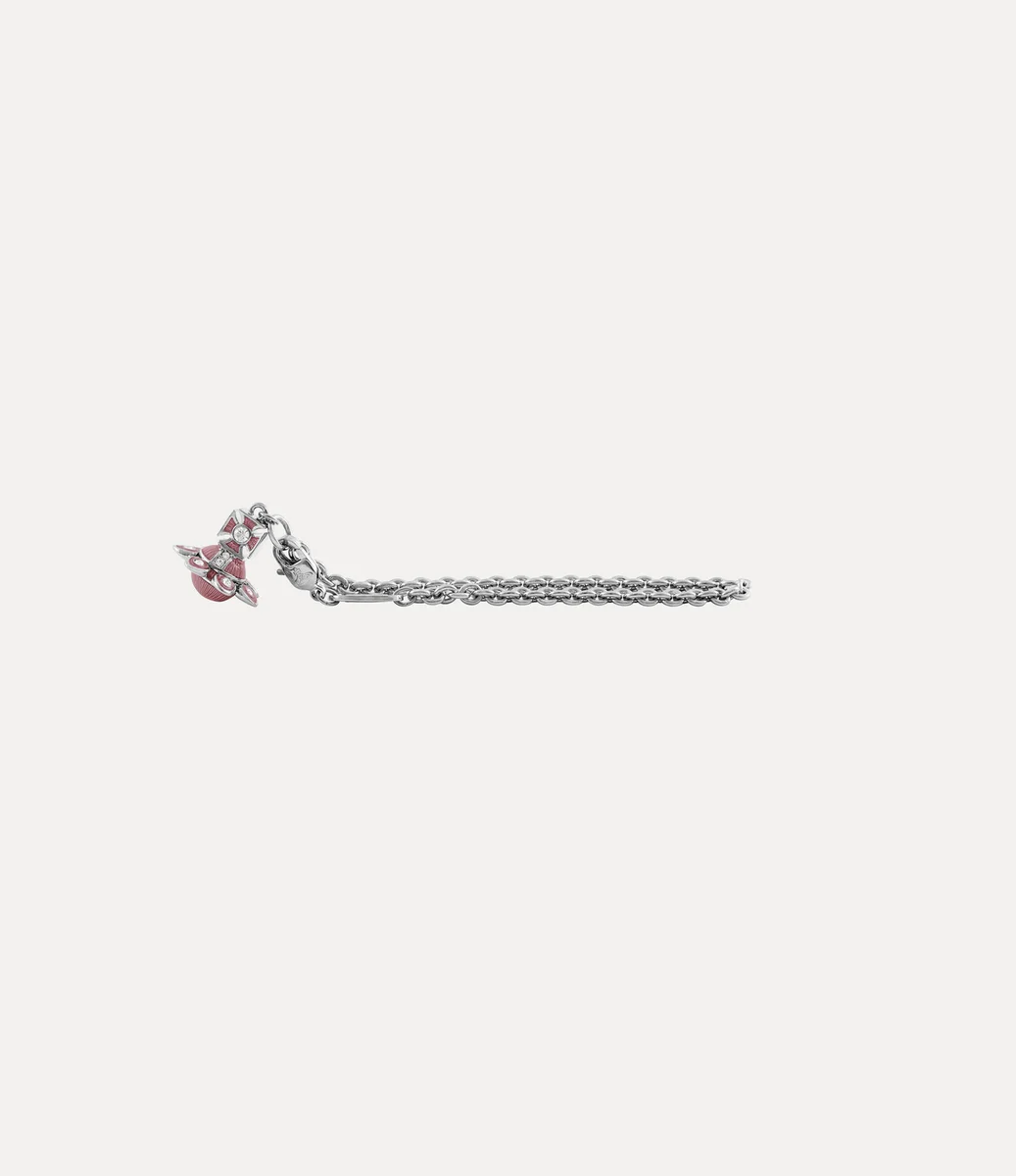 Our silver-tone Capucine bracelet reimagines the house’s heritage orb motif with delicate floral-inspired detailing along the Saturn ring. The design is finished with a subtle ridged texture through the orb’s centre and cross top, hand-painted with light pink translucent enamel.