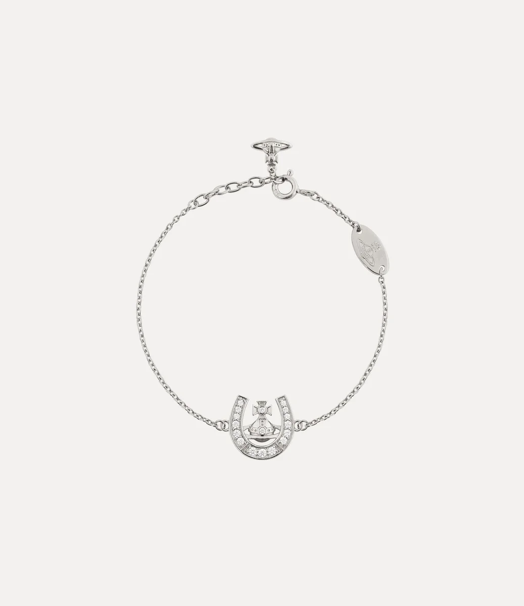 Vivienne Westwood Mare bracelet in recycled silver is encrusted with glistening tonal crystals and features a central horseshoe motif.