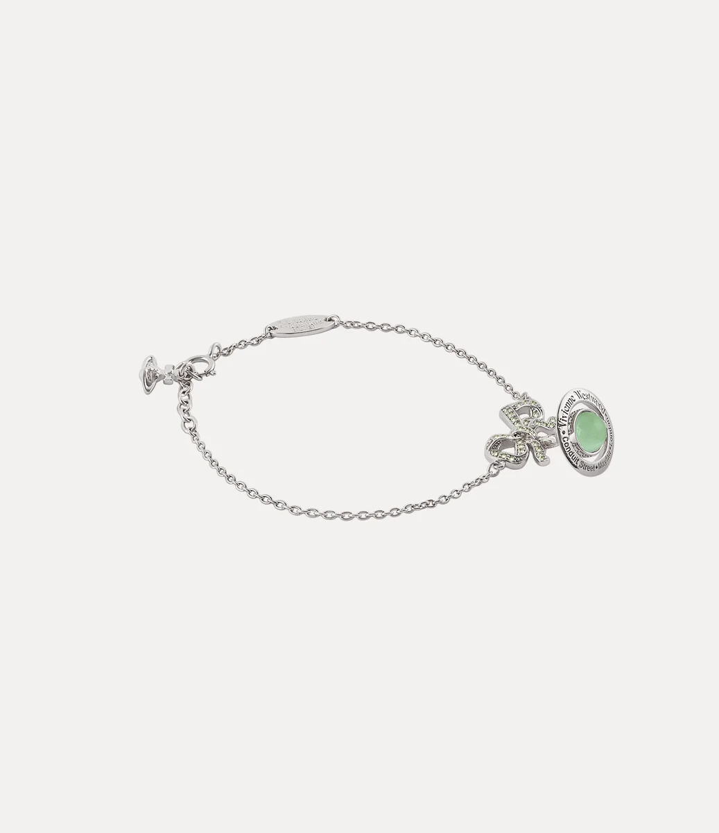 The Octavie bracelet is crafted from recycled silver with a polished platinum-tone plating and adorned with an intricate Georgian-inspired bow charm. Encrusted with glistening green pavé crystals, the design is finished with a tonal glass sphere at its centre, paired with our signature metal orb branding.