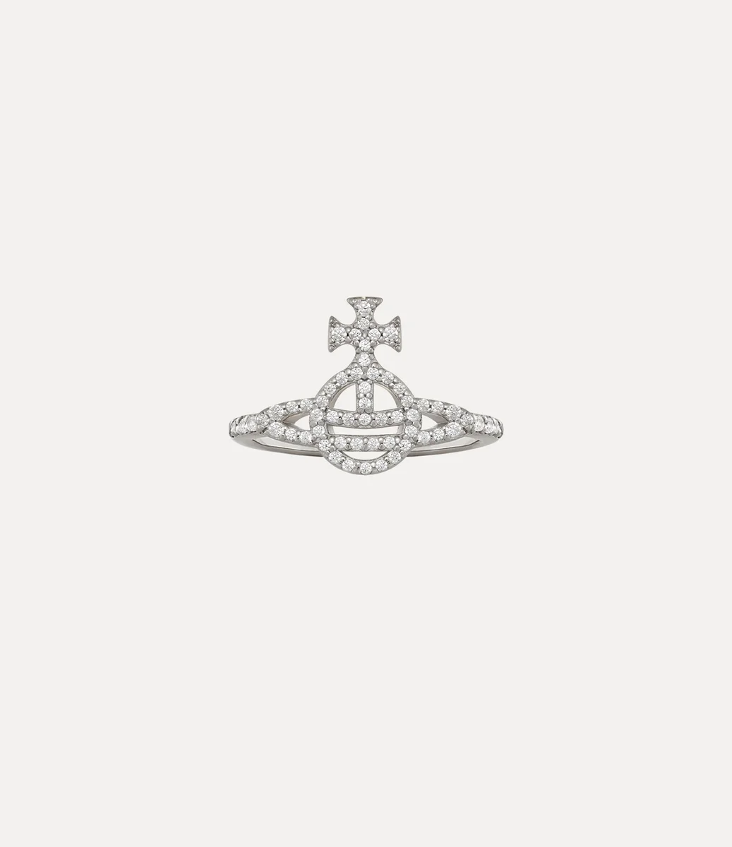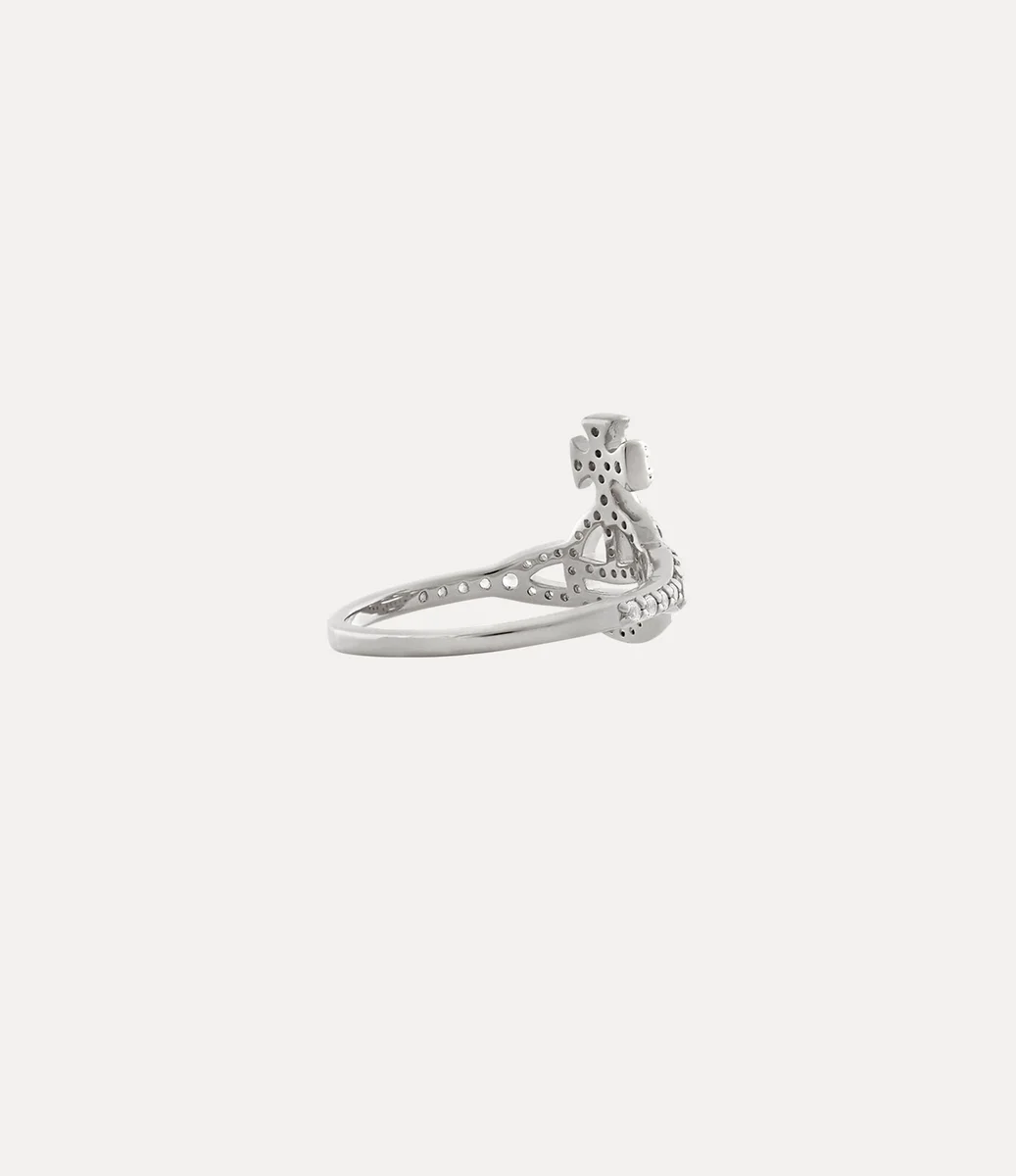 Our Calliope ring features a delicate band adorned with pavé crystals in shades of white, tracing the shape of the orb motif at the face of the design – synonymous with Vivienne’s vision of launching tradition into the future. The piece receives intricately engraved details, complete with our signature typography on the inner side of the band.