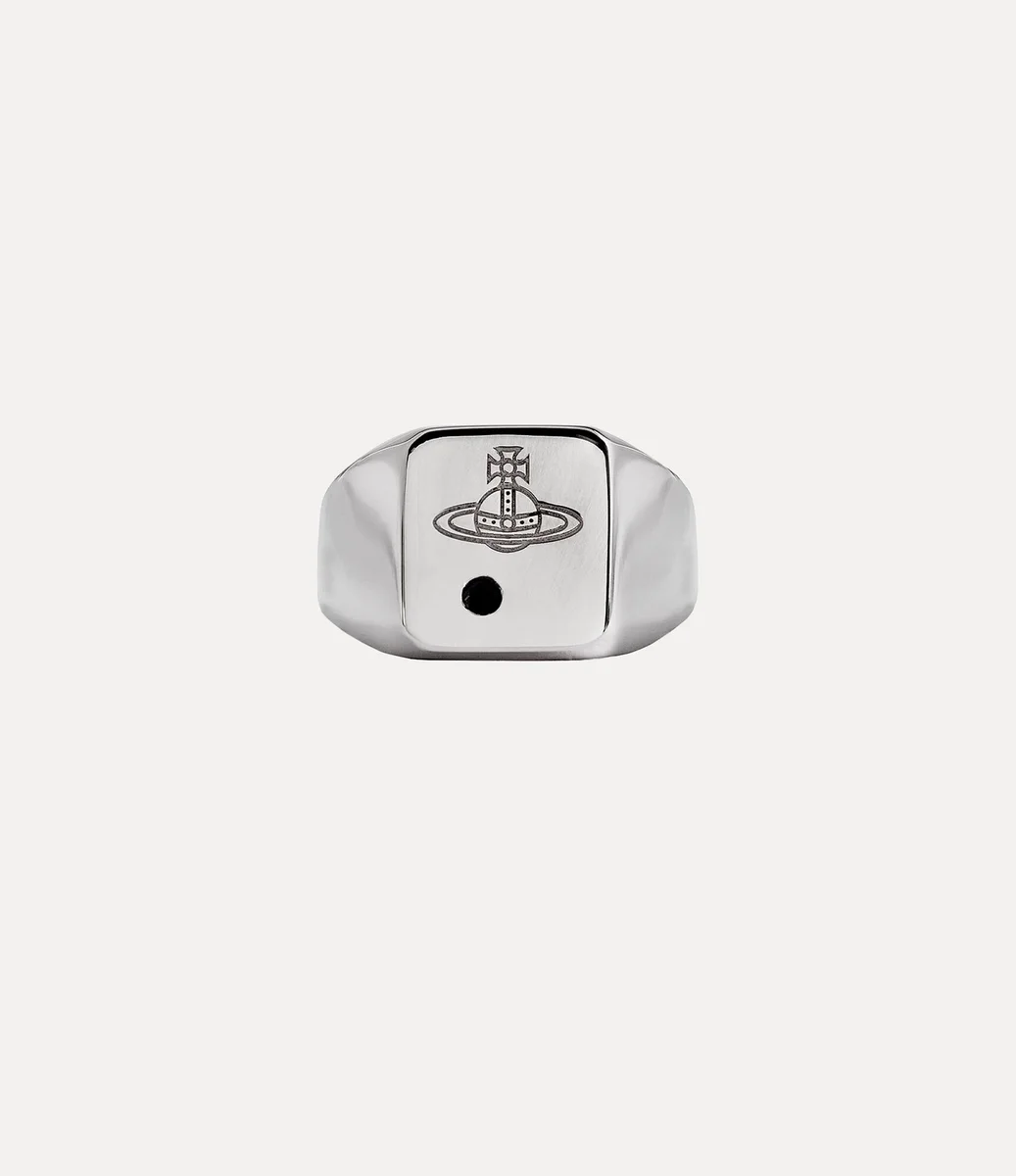 Our Carlo ring showcases a timeless signet silhouette, finished in platinum-tone silver. The square face is accented with a black crystal detail, complemented by an engraved orb motif symbolising tradition, and surrounded by the celestial rings of Saturn, representing the future.