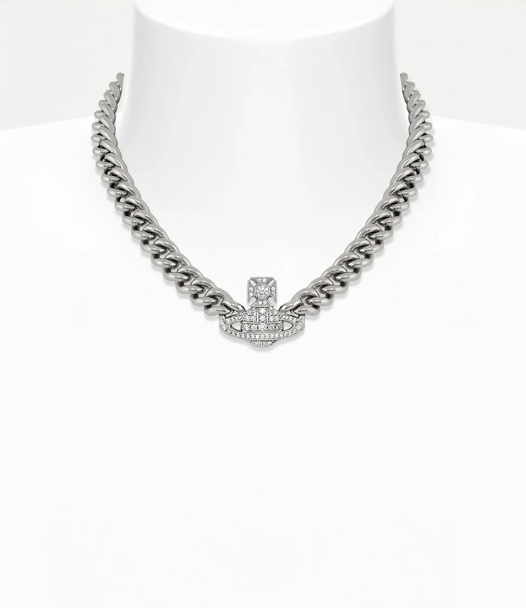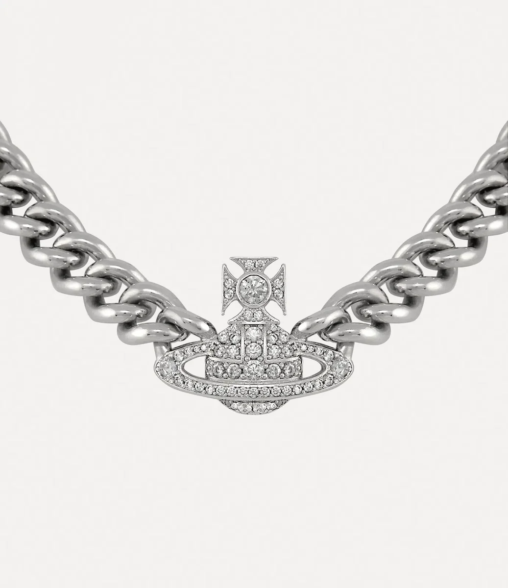 Our Graziella Small choker showcases our iconic orb motif in the centre of the design, embodying Vivienne’s vision of launching tradition into the future. The piece is adorned with white cubic zirconia crystals and silver-tone plating, complete with a single curb chain.
