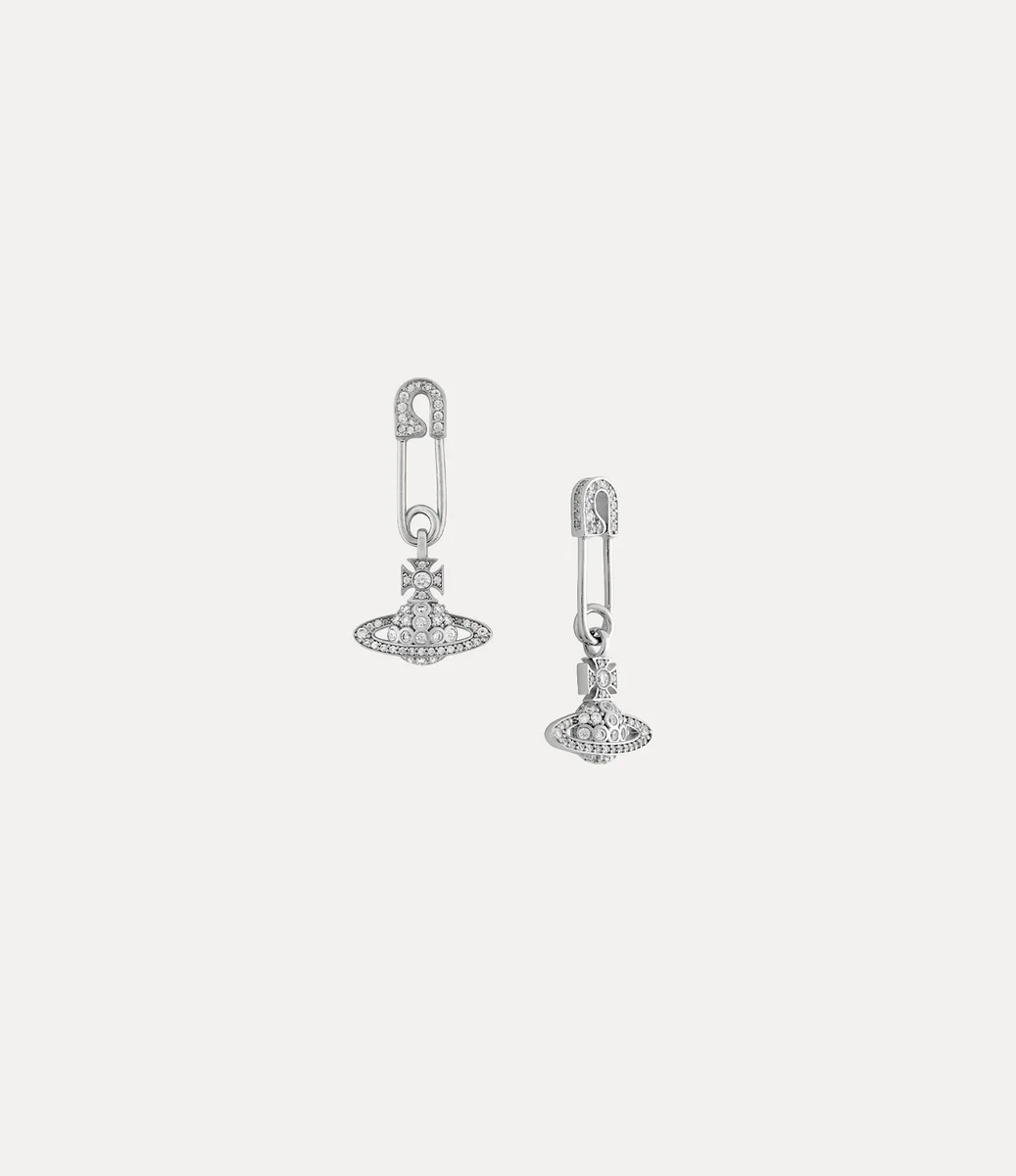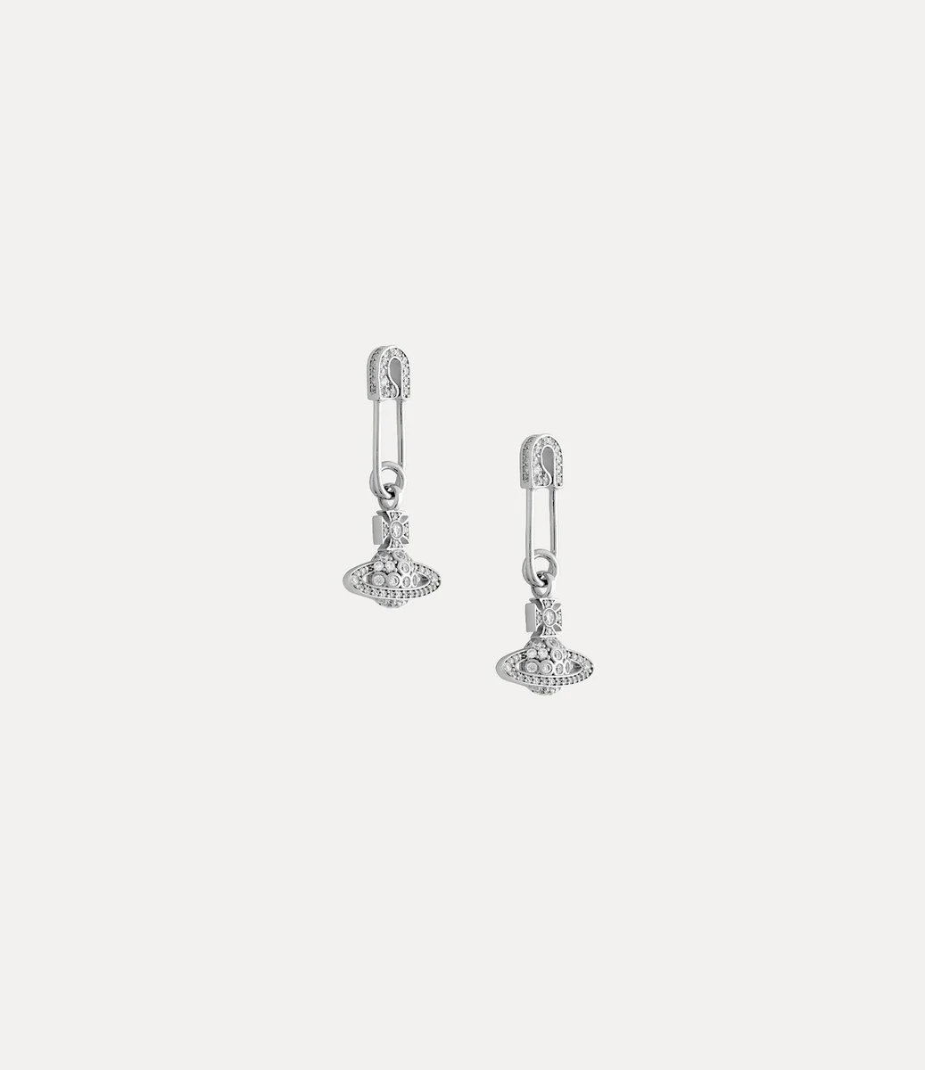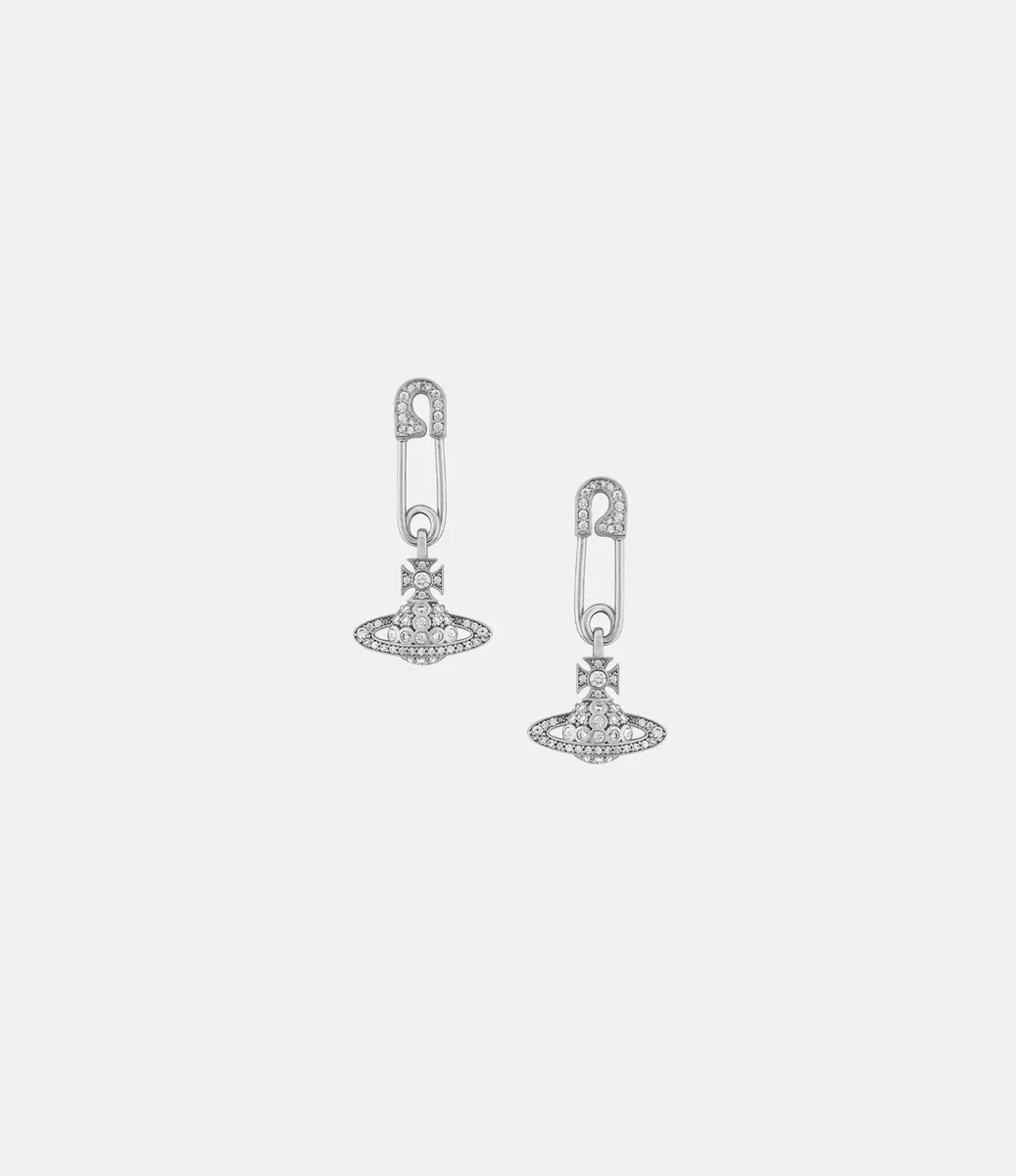 The Lucrece earrings feature a safety pin silhouette, recalling Vivienne’s rebellious punk aesthetic. The piece offers a drop design with a dangling orb detail, complete with shimmering crystal adornments and polished, silver-tone plating.