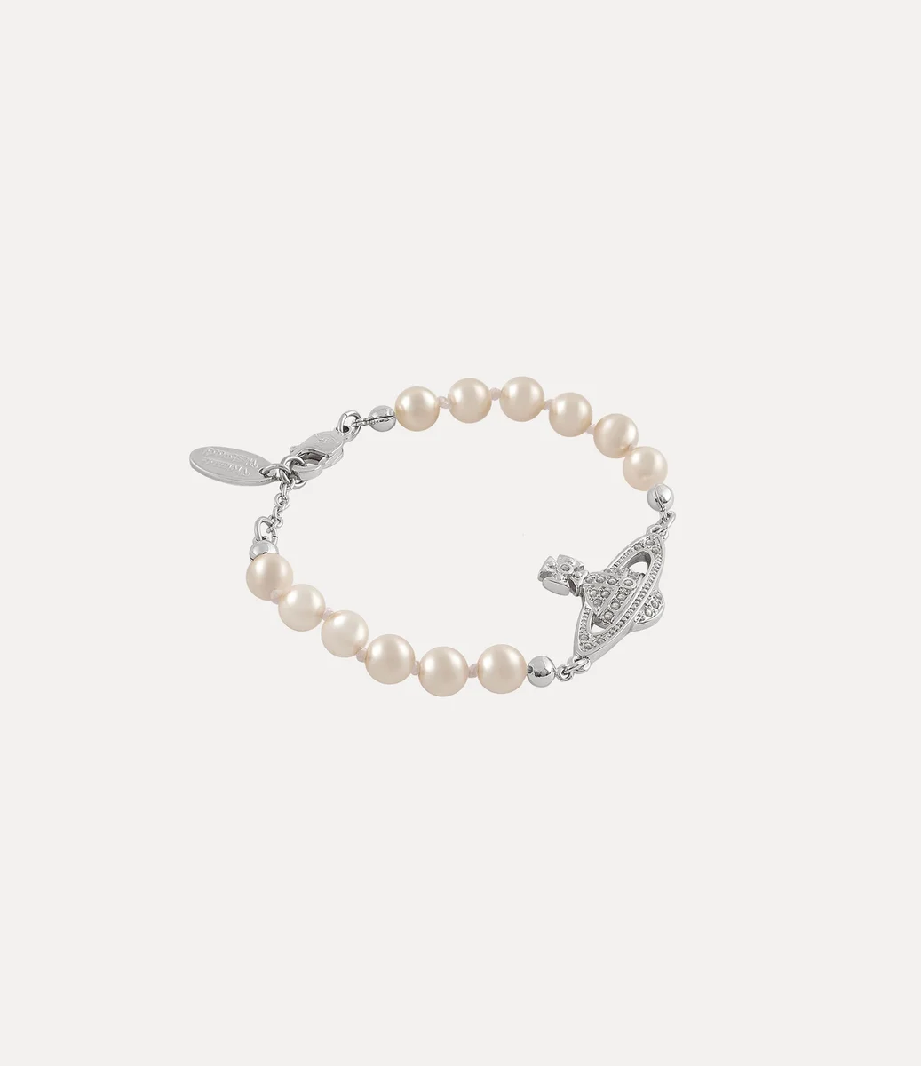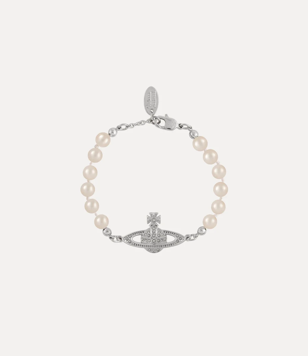 Pearls are a key component of the house’s imagery, symbolising luxury and rebellion. The Mini Bas Relief Pearl bracelet offers a row of glass-based pearls, adorned with a crystal-encrusted orb motif in the centre of the design – synonymous with Vivienne’s vision of taking tradition into the future.