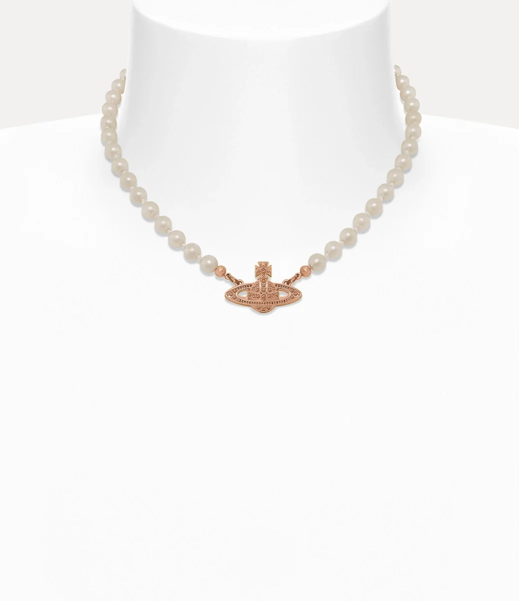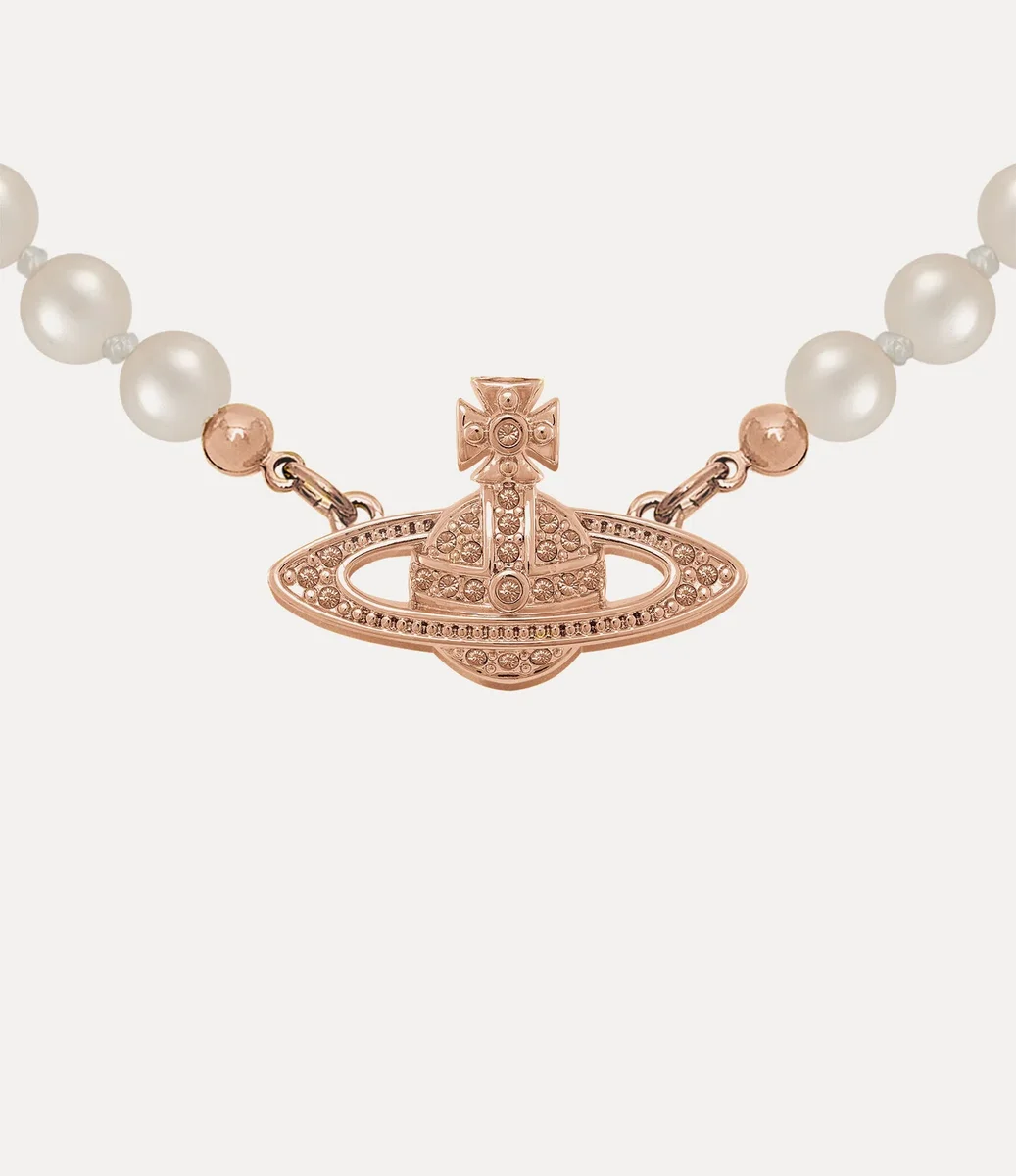 In the late 1980s, Vivienne Westwood introduced her iconic pearl concept at the Harris Tweed Fall 1987 fashion show, featuring a single-strand choker. Our Mini Bas Relief Pearl choker takes inspiration from this original design, reimagining it with the classic orb motif at the centre, enhanced by glistening crystals – recalling the house’s ethos of linking the past with the future.