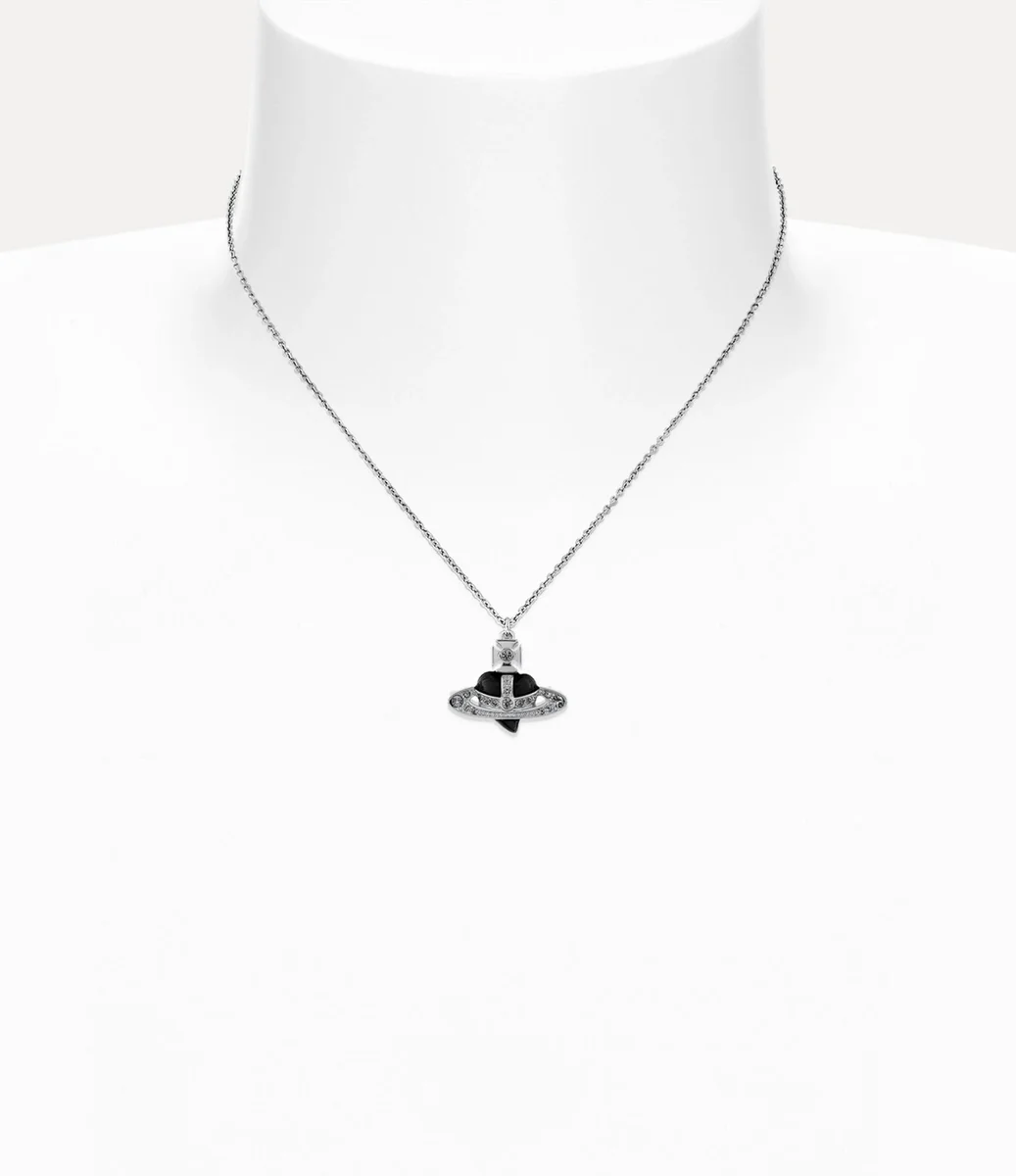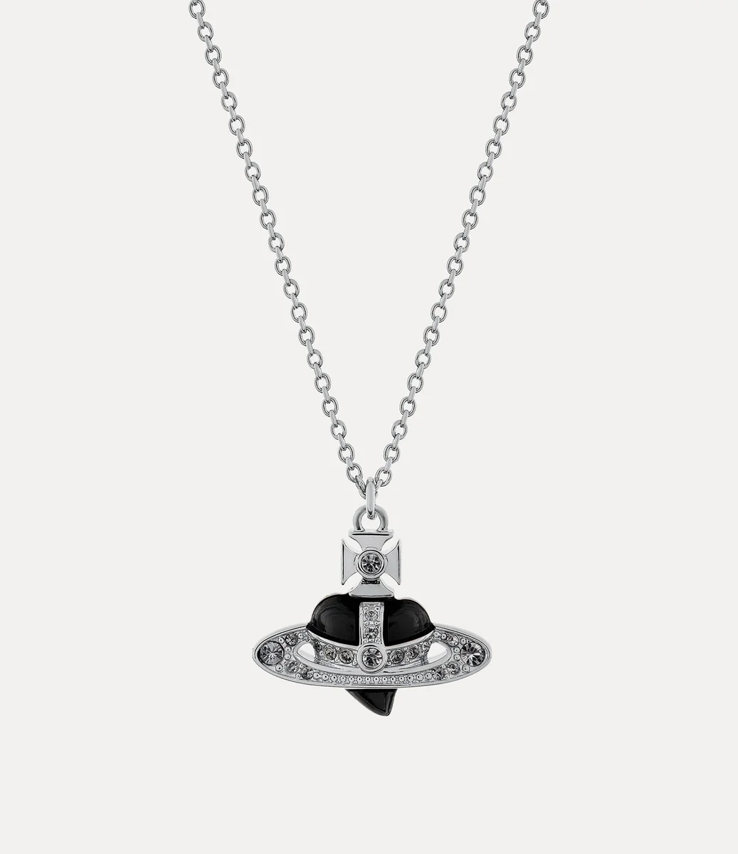 Our New Diamante Heart Pendant necklace features a silver-tone metal profile, complete with crystal-embellished details and an asymmetric heart silhouette. The heart shape has become a signature style of the house, synonymous with Vivienne’s affection for both humanity and the planet.