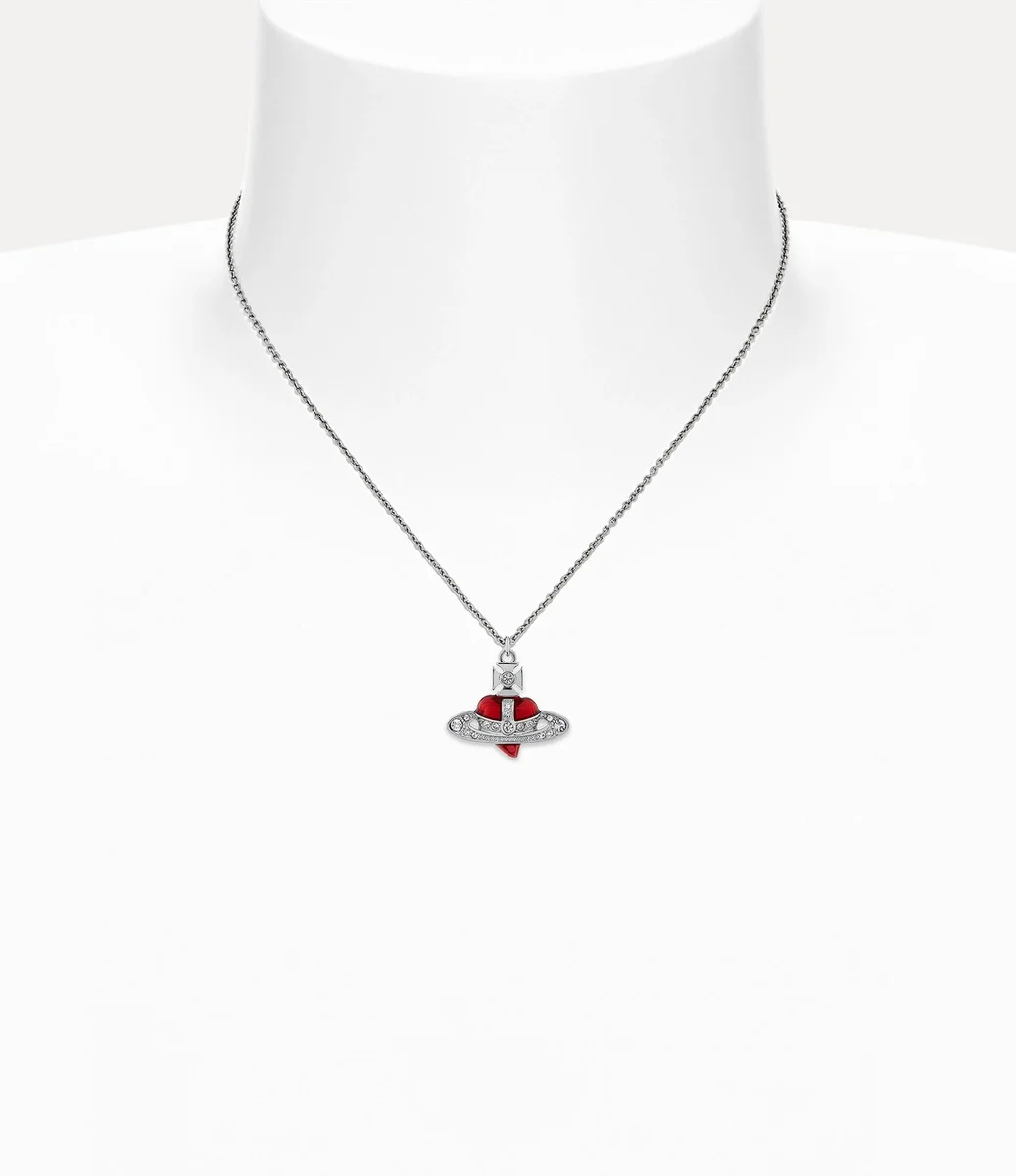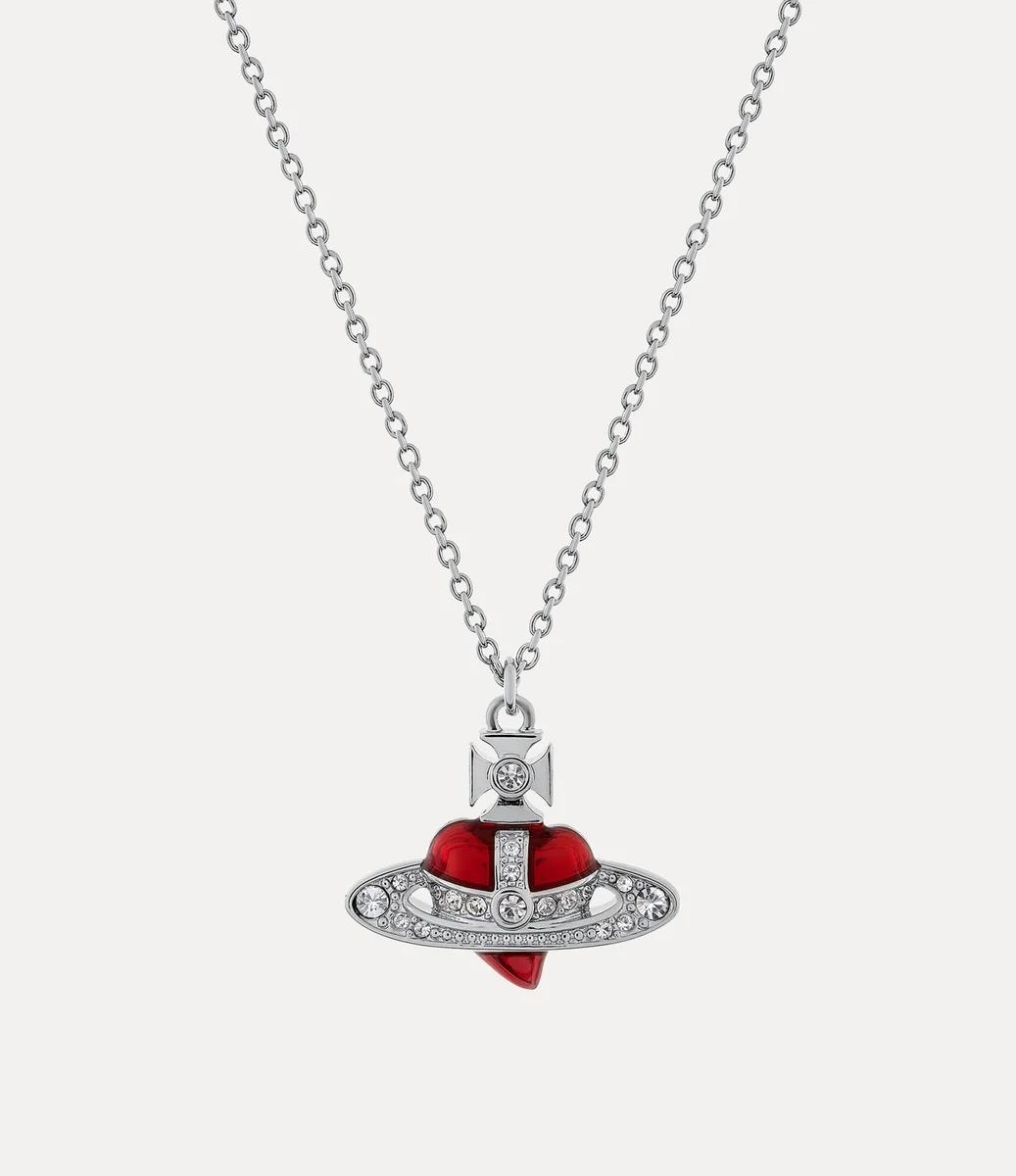 The heart shape has become a signature style of the house, synonymous with Vivienne’s affection for both humanity and the planet. Our New Diamante Heart Pendant necklace revives our iconic asymmetric heart silhouette, outlined with white-coloured crystals and finished with red enamel in the centre of the design.