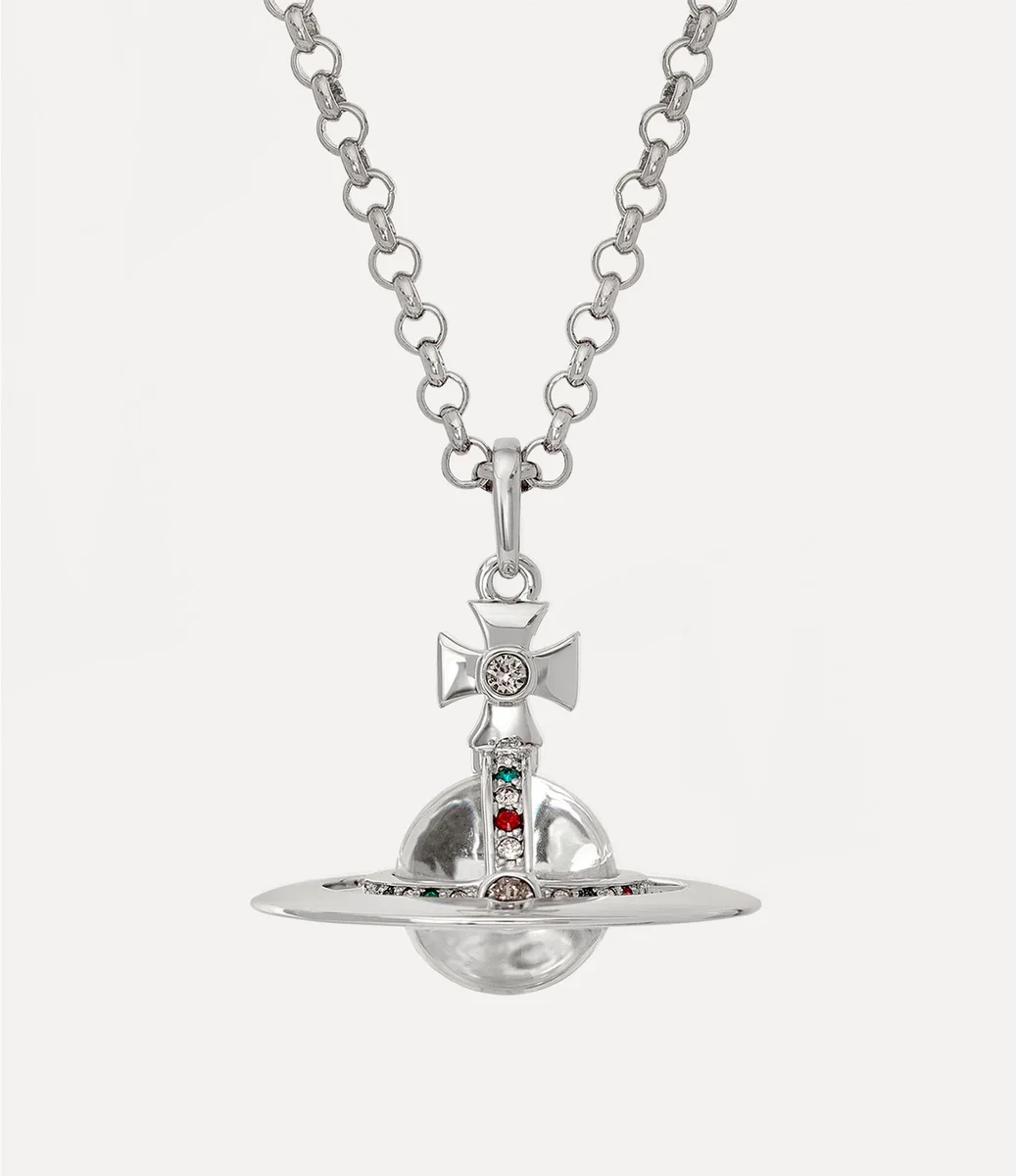 Our New Small Orb Pendant necklace features a distinct three-dimensional orb with a clear sphere glass ball at its center, inspired by the house’s iconic orb-shaped motif, recalling Vivienne’s vision of blending tradition with the future. Encrusted with an array of multi-colored crystals, the necklace is completed with an embossed tag at the fastening.