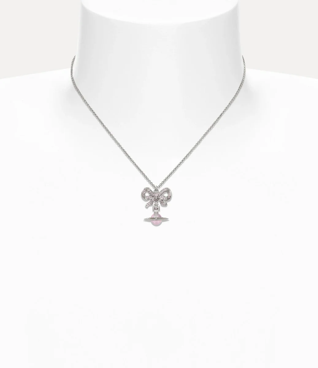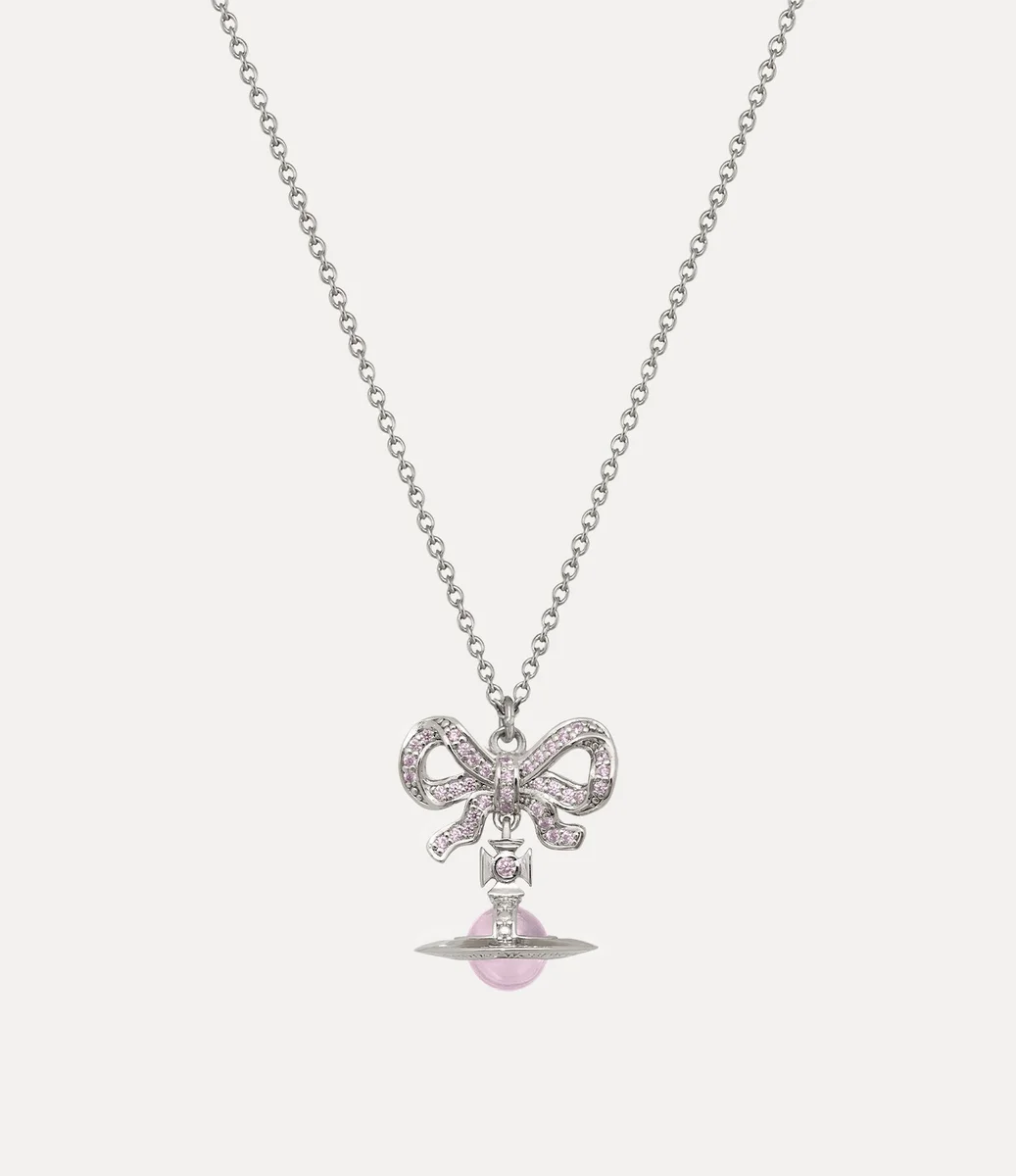 Our Octavie Pendant necklace is crafted from recycled silver and finished with polished platinum-tone plating. Embellished with sparkling white crystals, the design combines a Georgian-style bow with our signature three-dimensional orb at the centre, rendered in a soft pink finish, echoing the house’s classic orb motif.