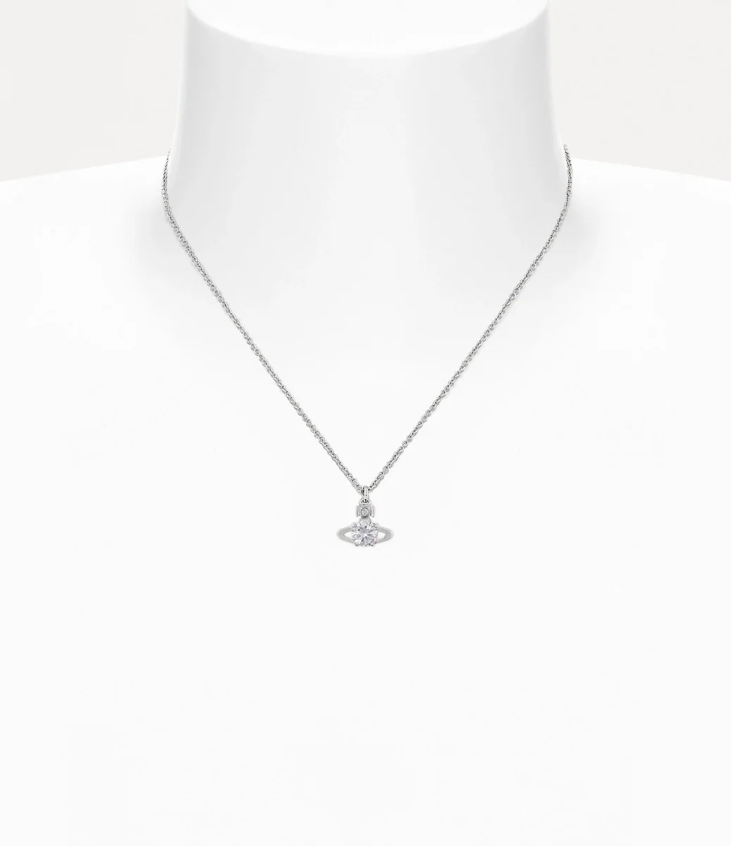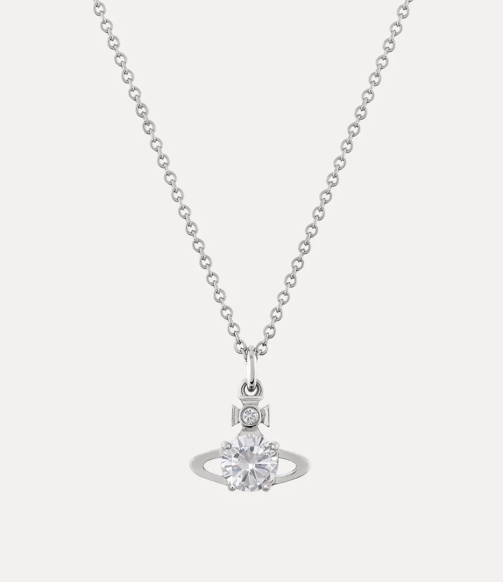 Our signature orb motif detail features in the centre of this season’s Reina Pendant necklace – synonymous with Vivienne’s vision of taking tradition into the future. The piece receives an adjustable chain with a letter-engraved tag hanging from the lobster fastening, complete with a silver-tone finish and adorned with white crystals.