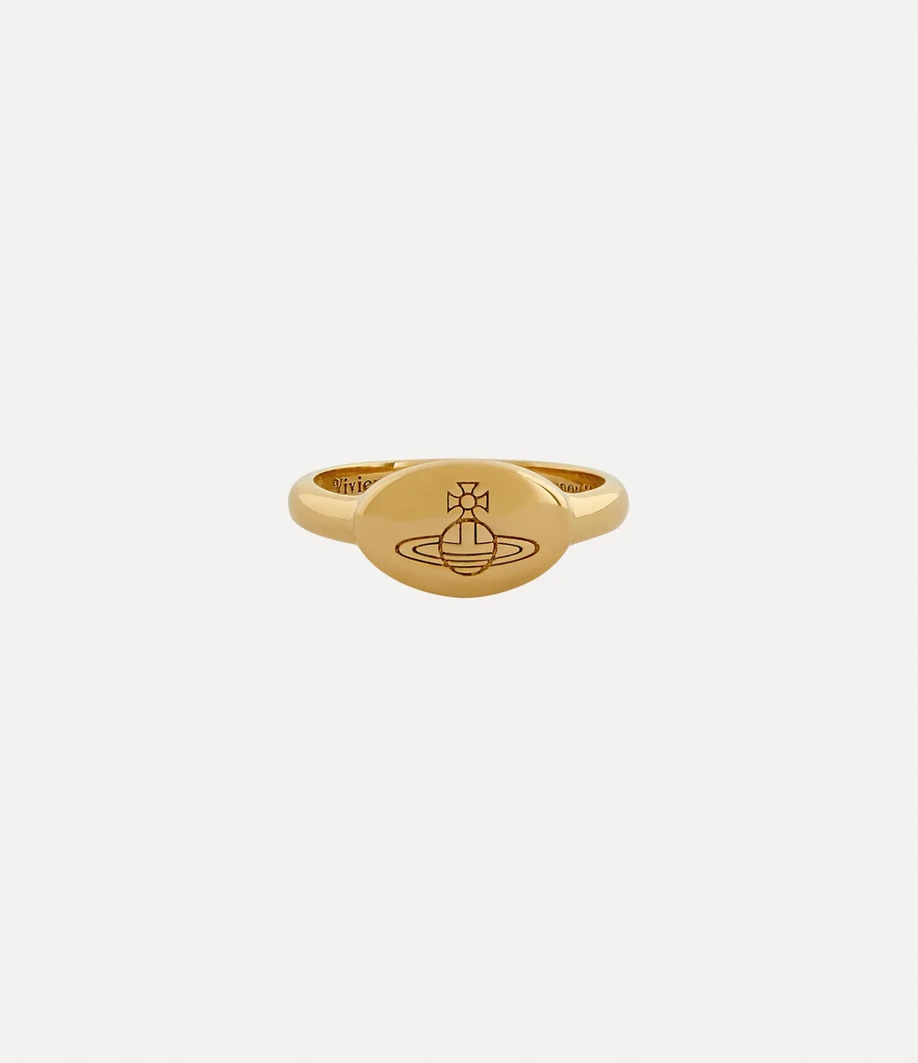Our Tilly ring features a classic signet silhouette, complete with a recycled silver finish and enhanced by gold-tone plating. This Vivienne Westwood ring is adorned with an oval-shaped face, featuring an engraving of our signature line orb, enriched with patina to elevate the overall aesthetic – recalling Vivienne’s vision of launching tradition into the future.