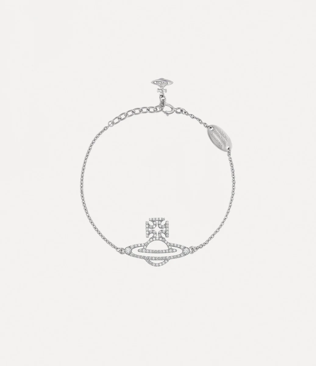 Our Trudy bracelet revives our classic orb motif, reminiscent of Vivienne’s vision of launching tradition into the future. The design is adorned with pavé-set crystals and features a dangling orb charm at the clasp, all elegantly finished with a fine link chain.