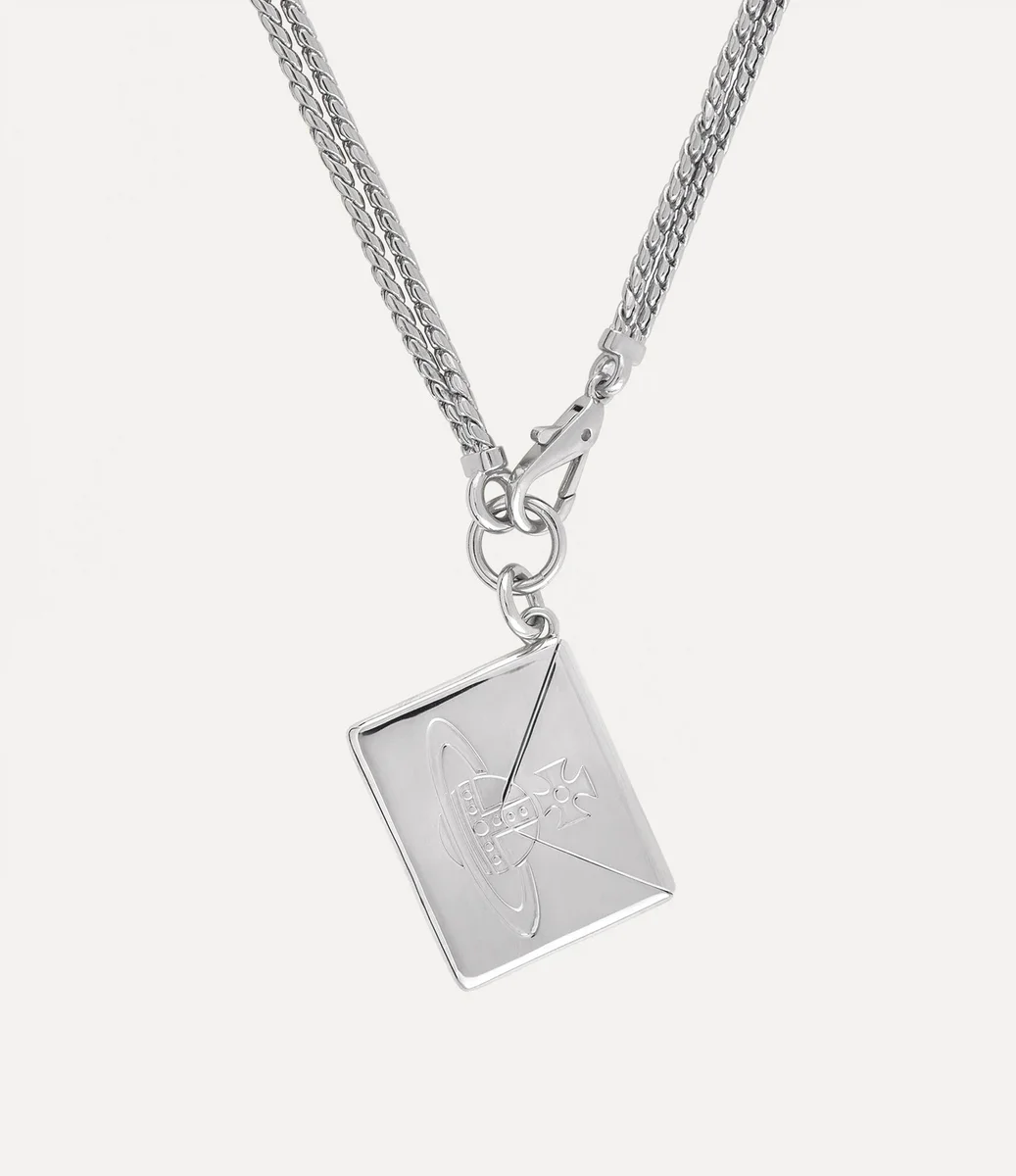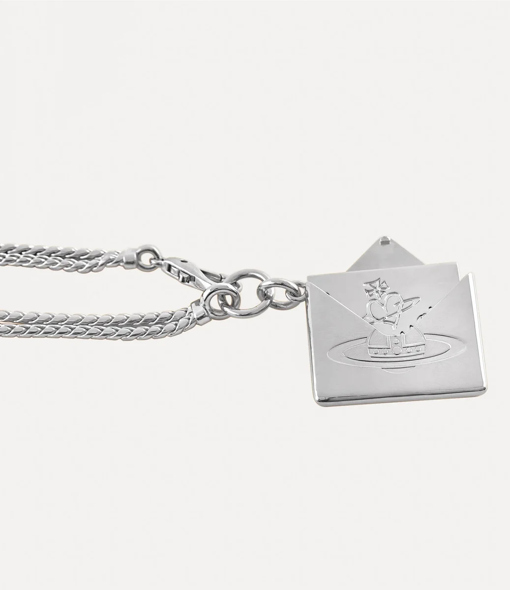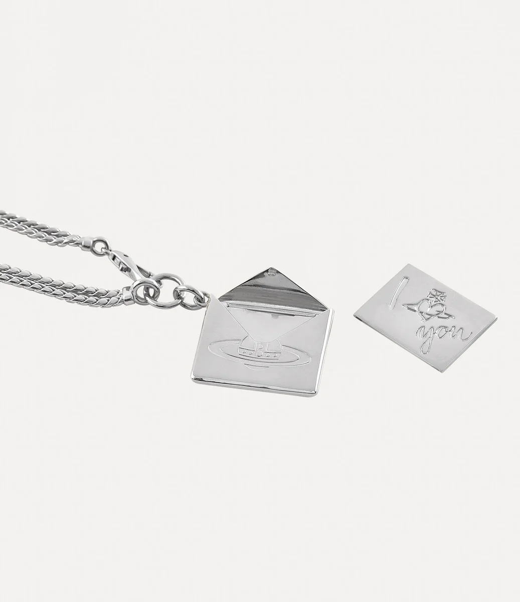 Our Valentine’s Envelope Pendant necklace features a double chain silhouette crafted from silver-tone plated metal, enhanced with black patina details. The front showcases our signature orb motif, a symbol of Vivienne’s vision of launching tradition into the future, while the back is engraved with the Vivienne Westwood flagship boutique. The necklace opens to reveal a cast letter inside, inscribed with the heartfelt note “I love you.”
