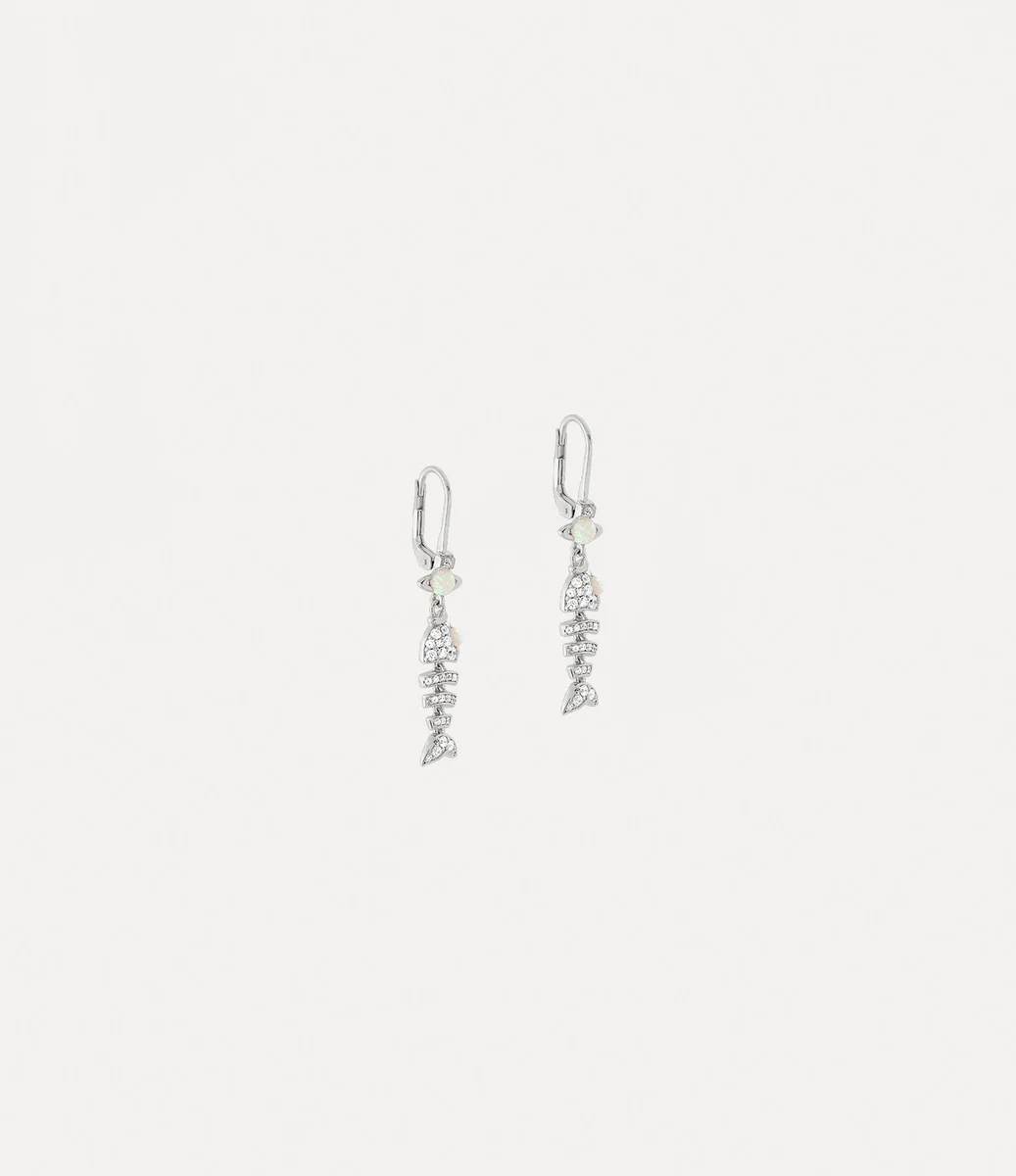 Vivienne Westwood Lyall earrings in recycled silver feature a fish bone silhouette, adorned with white crystal details and opalised gemstones.