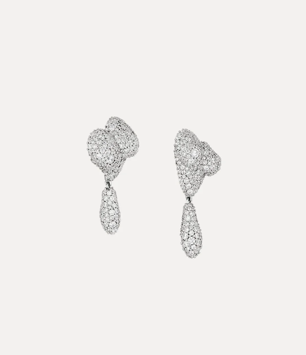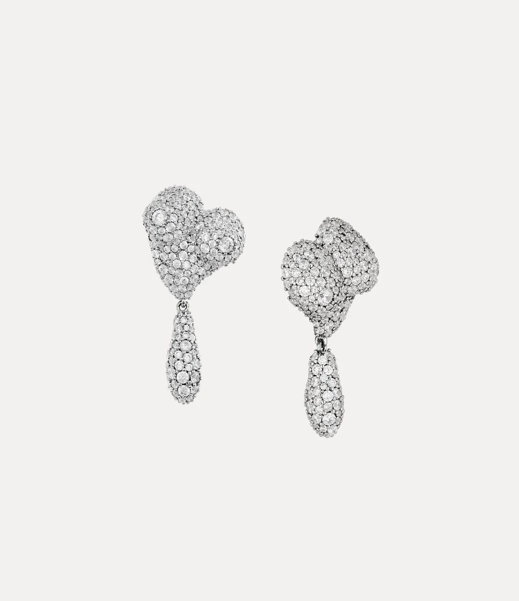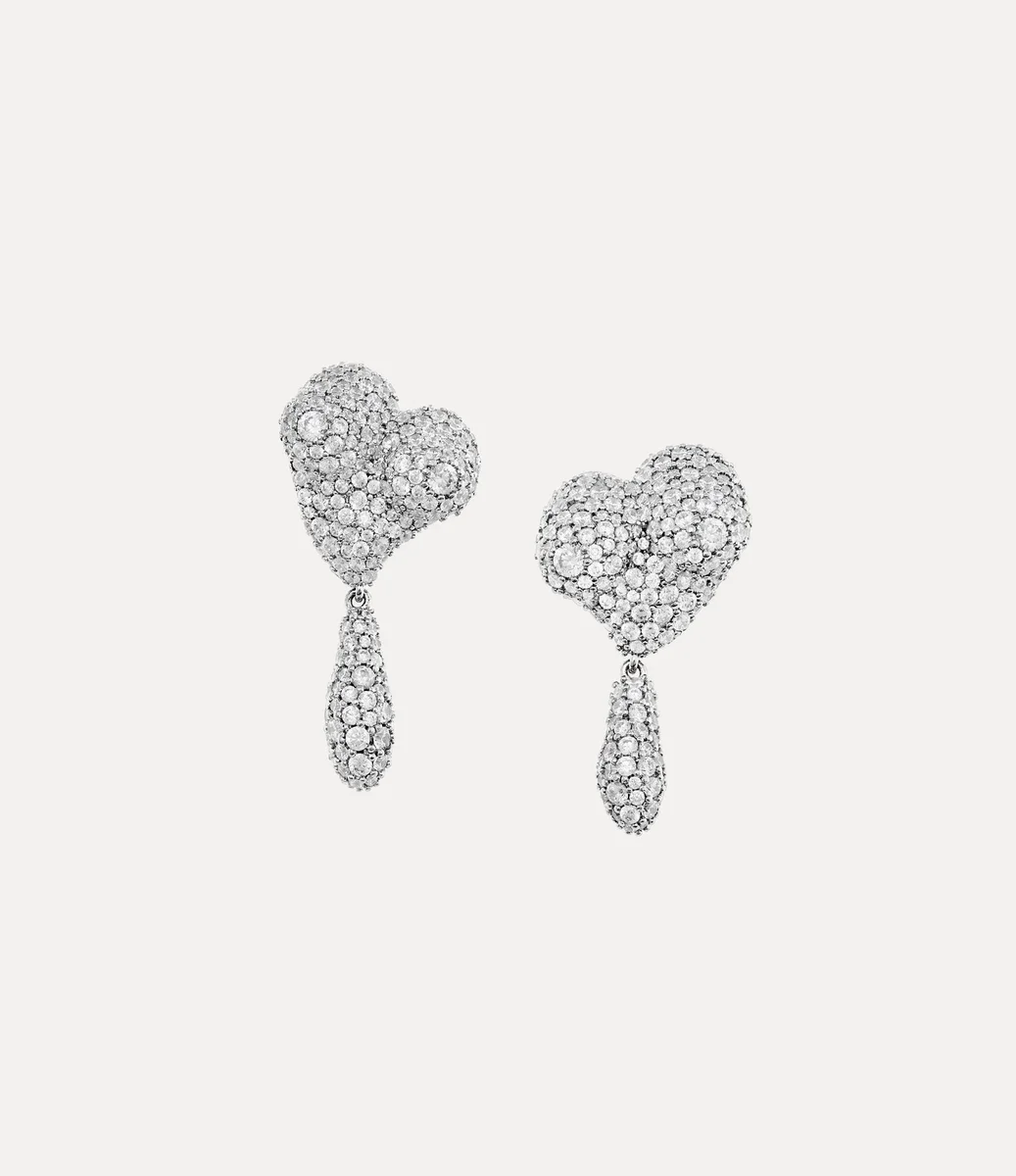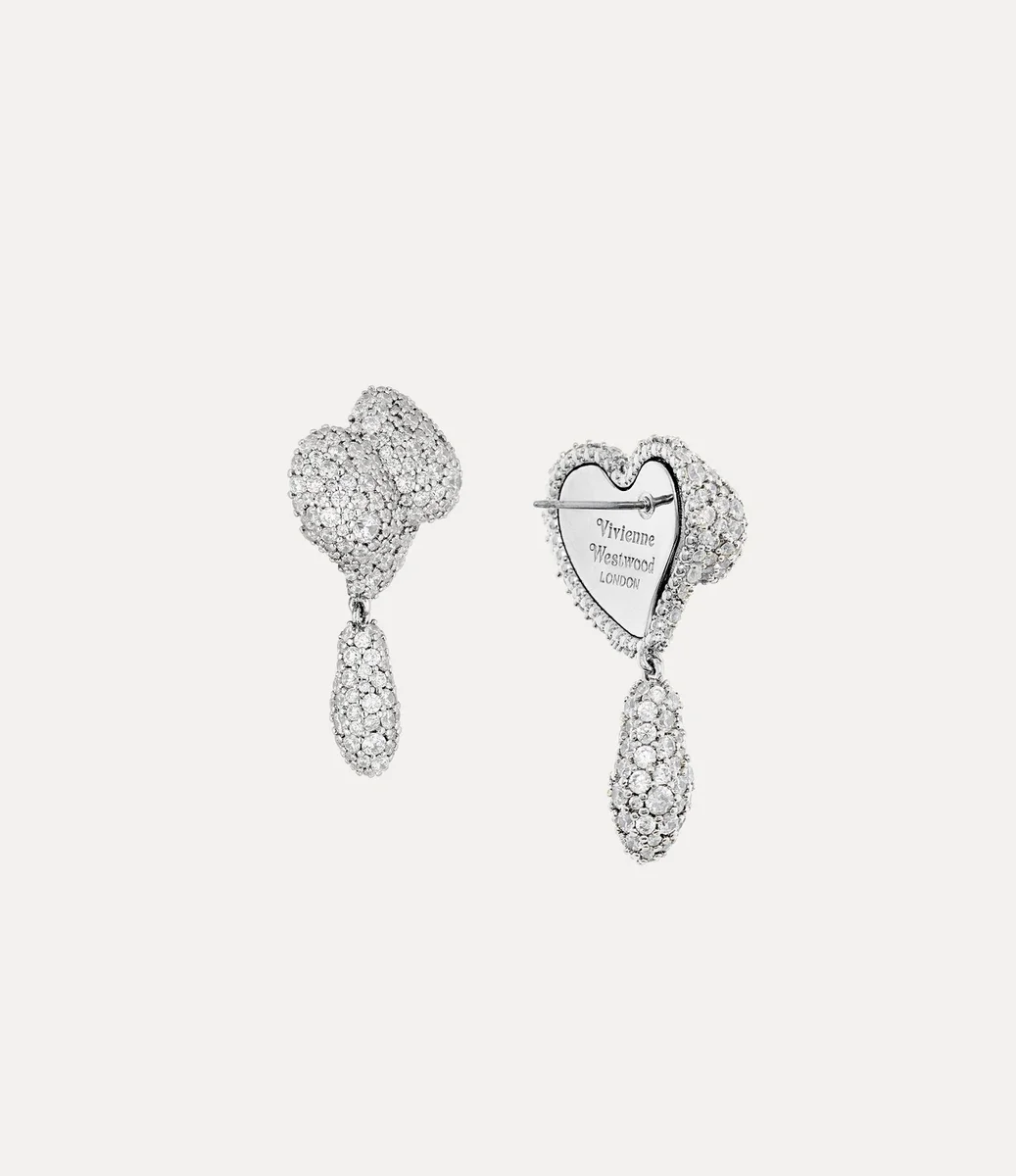 Vivienne Westwood Mimosa Pave earrings revive the house’s classic asymmetrical heart-shaped motif, encrusted with tonal crystal details and complete with a dangling drop.