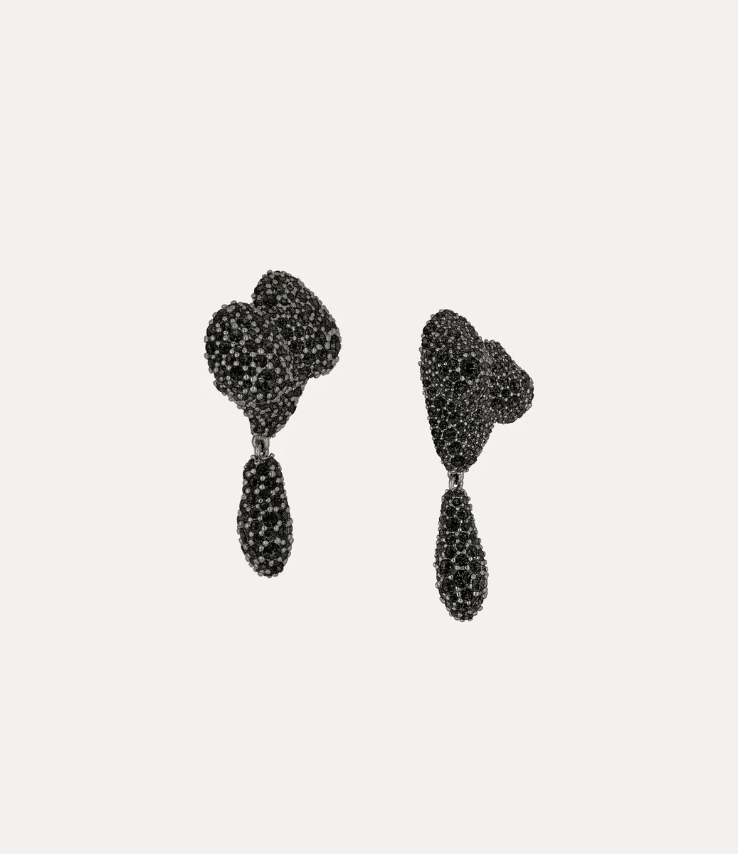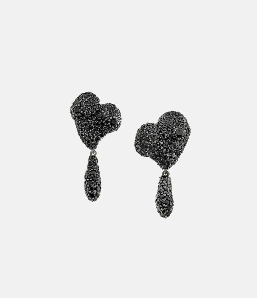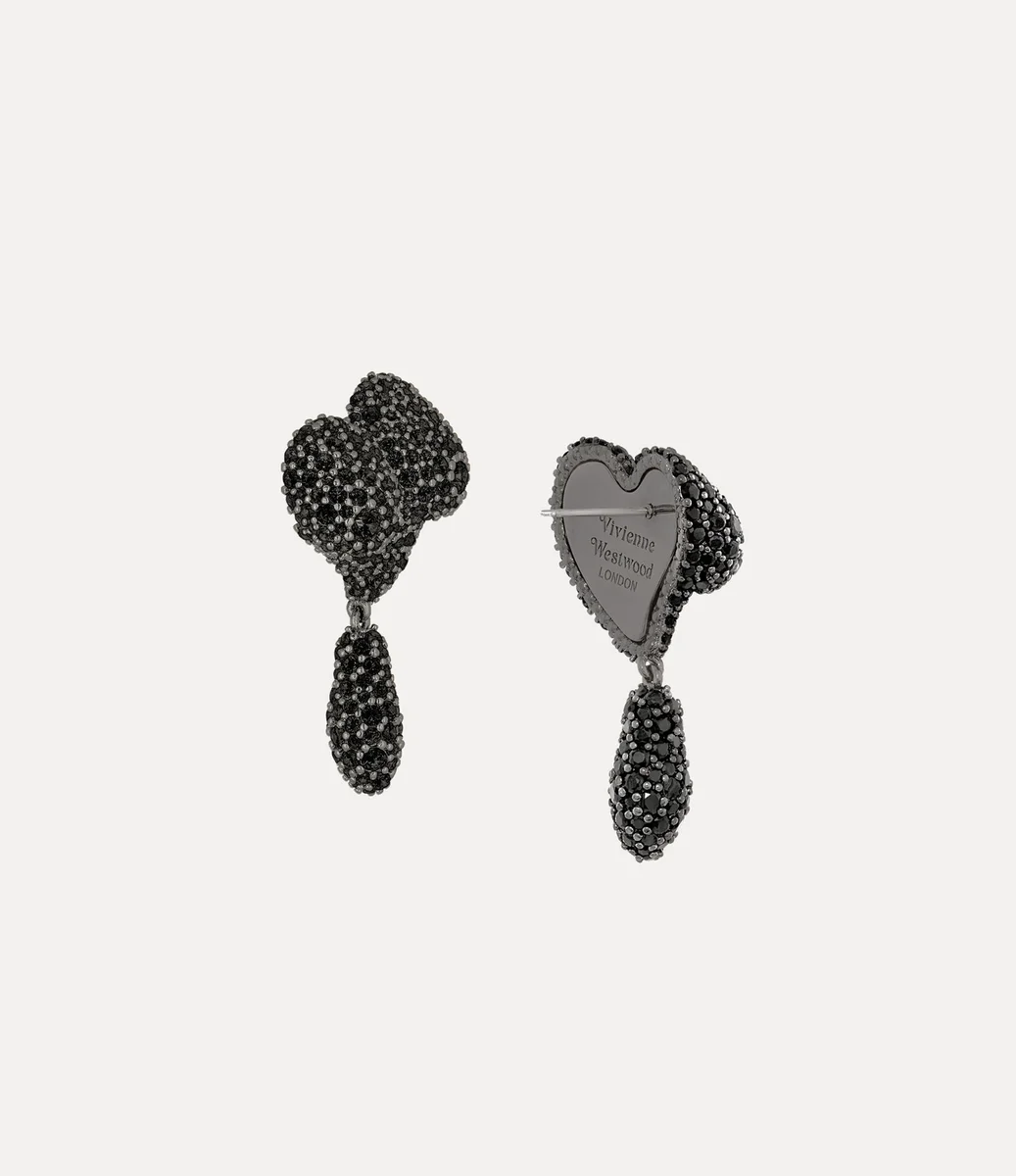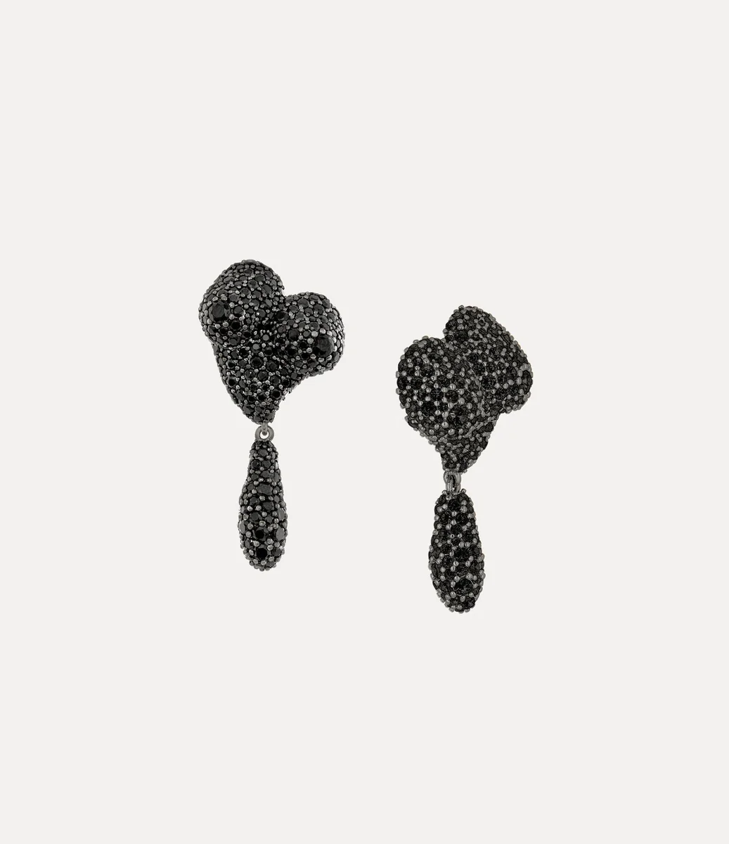 Our Mimosa Pave earrings revive the house’s classic asymmetrical heart-shaped motif, recalling Vivienne’s affection for humanity and the planet. Encrusted with black crystal details, the piece is delicately sculpted into a tapered point, complete with a dangling drop.