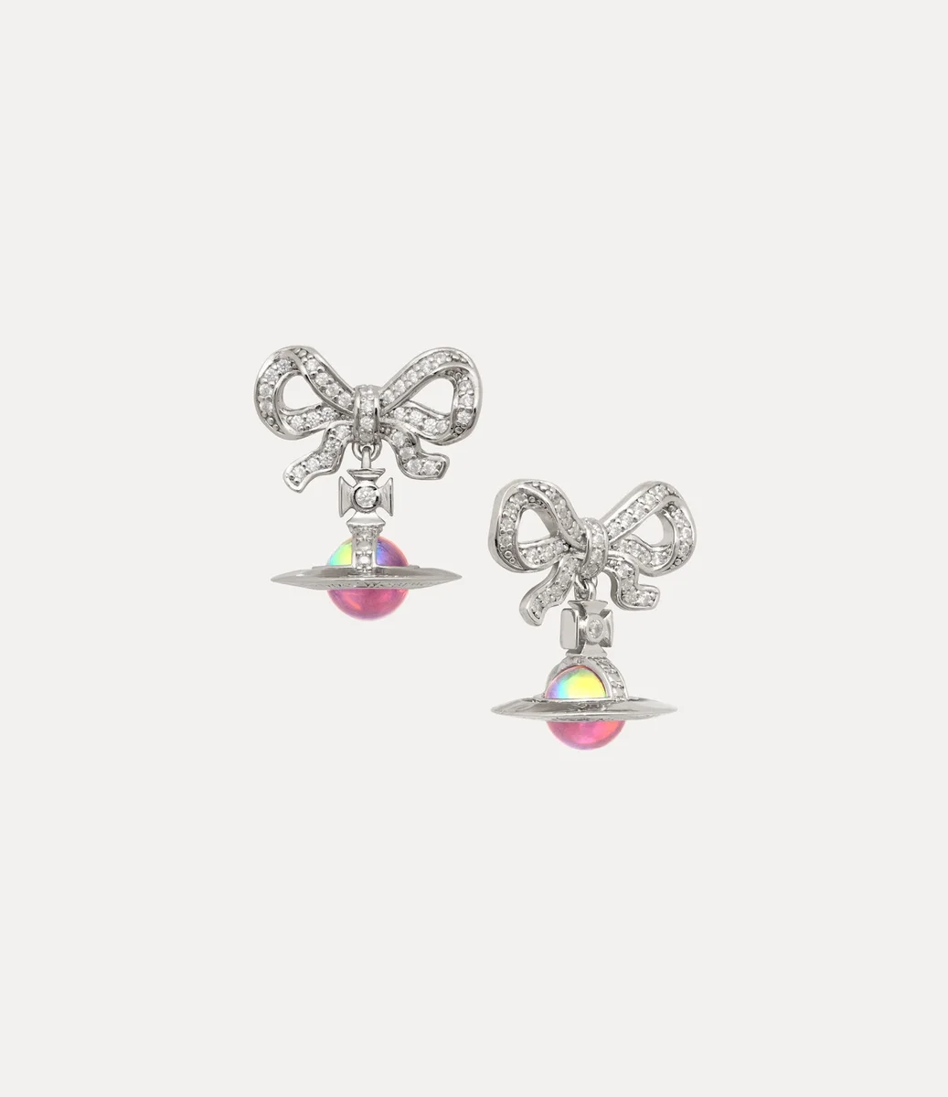 Our Octavie earrings are crafted from recycled silver and finished with polished platinum-tone plating. Embellished with sparkling white crystals, the design combines a Georgian-style bow with our signature three-dimensional orb at the centre, rendered in a pink iridescent finish, echoing the house’s classic orb motif.